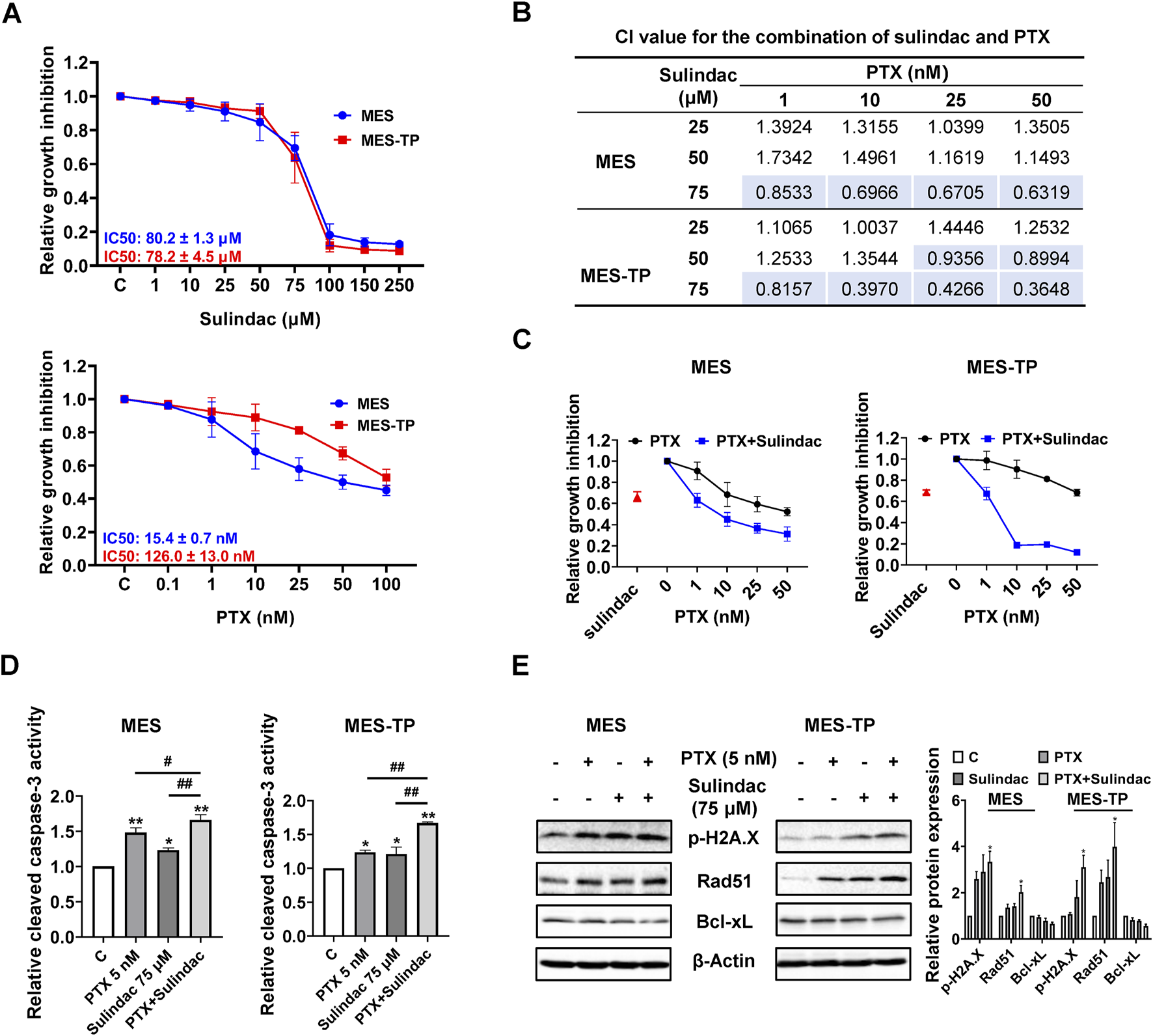 Figure 8. The combination of sulindac and PTX synergistically enhances cell growth inhibition in PTX-sensitive and -resistant OC cells The MES and MES-TP cells were treated with sulindac (1, 10, 25, 50, 75, 100, 150 and 250 µM), PTX (0.1, 1, 10, 25, 50 and 100 nM), and the combination for 72 h. MTT assay revealed the inhibitory effects of sulindac and PTX on cell proliferation (A). The CI value for the combination of sulindac (25, 50, and 75 µM) and PTX (1, 10, 25 and 50 µM) was calculated by CompuSyn for each combination group (B). MTT assay revealed changes in cell proliferation after treatment with sulindac (75 µM) and PTX (1, 10, 25, and 50 nM) in both cells (C). In both cell lines, the combination of sulindac (75 µM) and PTX (5 nM) significantly increased cleaved caspace3 levels after 14 h of treatment compared with either agent alone (D). Western blotting demonstrated the changes in the expression of phosphorylated H2A.X, Rad51, and Bcl-xL after treatment with sulindac, PTX or their combination in both cell lines (E). Data are presented as mean ± SD from three independent experiments. Statistical analysis was performed using one-way ANOVA with Tukey’s post hoc test. *p < 0.05, **p < 0.01, compared with control. #p < 0.05, ##p < 0.01, between groups.