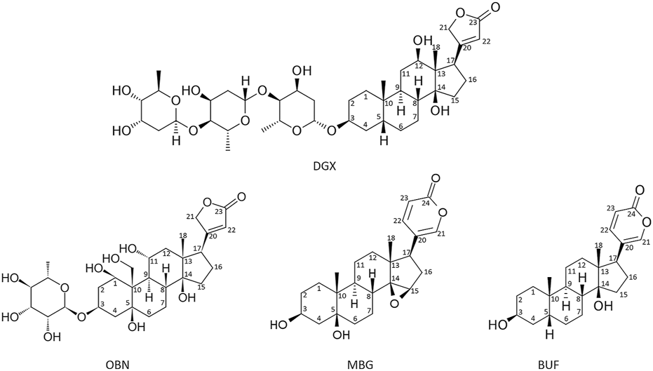 Figure 1. Formulas of the main cardenolides (digoxin (DGX) and ouabain (OBN)) and bufadienolides (bufalin (BUF) and marinobufagenin (MBG)). Images of CTS (2D structures) were obtained from PubChem (https://pubchem.ncbi.nlm.nih.gov/) and edited manually in MS PowerPoint.