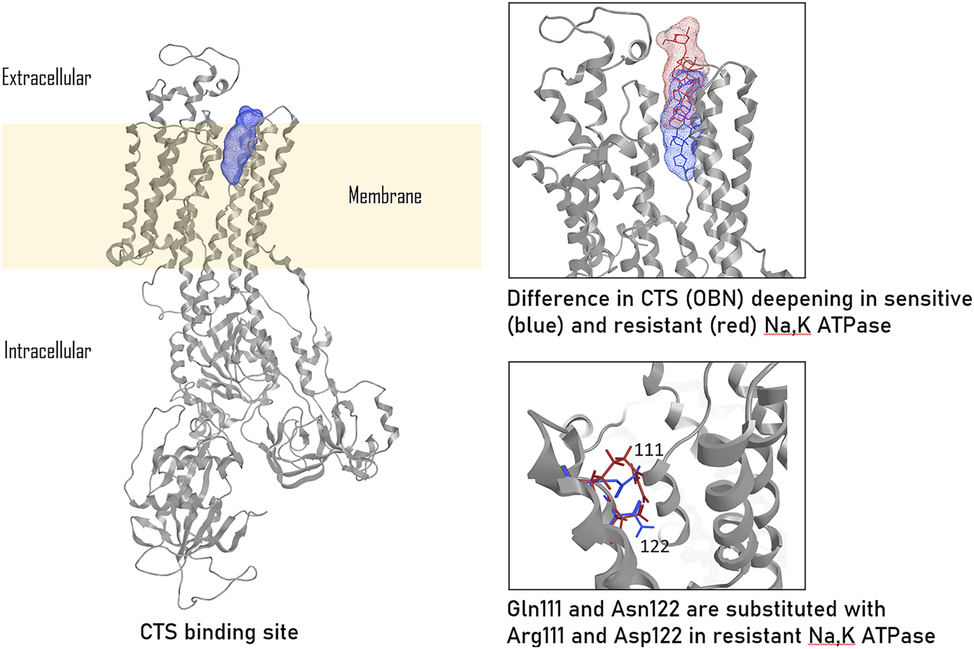 Figure 2. CTS binding to ouabain-sensitive and ouabain-resistant Na,K-ATPase, according to (Tverskoi et al., 2021). The ouabain (OBN) binding localization in sensitive Na,K-ATPase is colored in blue, ouabain binding localization in resistant (rat) Na,K-ATPase is colored in red. The presented images were based on the models published by us earlier (Tverskoi et al., 2021) and created in Moe2013.10.