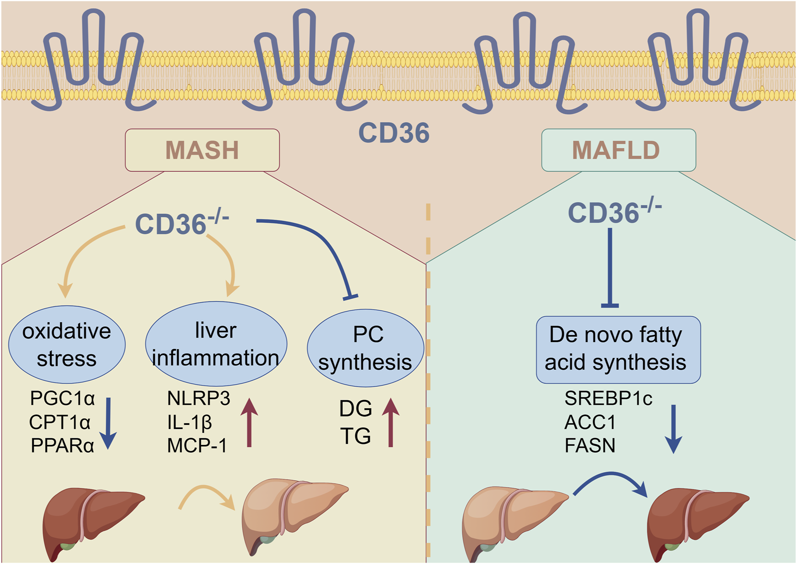 Collectively, our study demonstrates the dual effect of CD36 on MAFLD/MASH under HFD and MCD diets in which CD36 deficiency alleviated HFD-induced MAFLD by attenuating lipogenesis, but had the opposite effect on MCD-induced MASH. CD36 deficiency can cause lipid metabolism disturbance by activating inflammation, oxidative stress, and ultimately liver damage in MCD diet. The complex role of CD36 in MAFLD/MASH needs more investigation to discover the precise and effective strategy when targeting CD36.