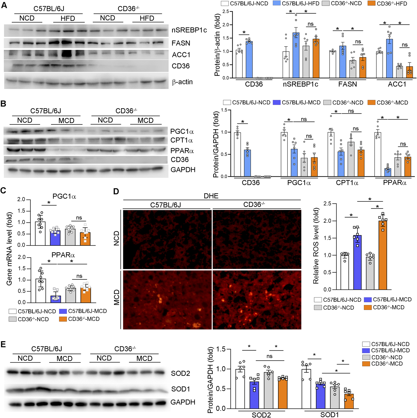 CD36-deficiency reduces HFD-induced hepatic fatty acid synthesis, but aggravates MCD-induced oxidative stress. (A–C, E) Total RNA and proteins were extracted from a piece of liver. The proteins expression of nSREBP2, FASN, ACC1, CD36 (A), PGC1α, CPT1α, PPARα, CD36 (Β), SOD1 and SOD2 (E) were determined by Western blot. The mRNA expression of PGC1α and PPARα were determined qPCR (C). (D) ROS in the liver was determined by Dihydrothidium (DHE) staining. *P < 0.05; ns, no significance (n = 6).