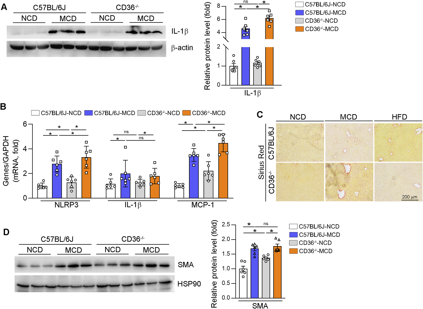 CD36 deficiency exacerbates MCD-induced MASH by increasing liver inflammation. (A, B, D) Total RNA and proteins were extracted from a piece of liver. The protein expression of IL-1β (A) and SMA (D) was determined by Western blot. The mRNA expression of NLRP3, IL-1β and MCP1 was determined by qPCR (B). *P < 0.05; ns, no significance (n = 6). (C) Liver fibrosis was determined by Sirius Red staining with liver paraffin sections.