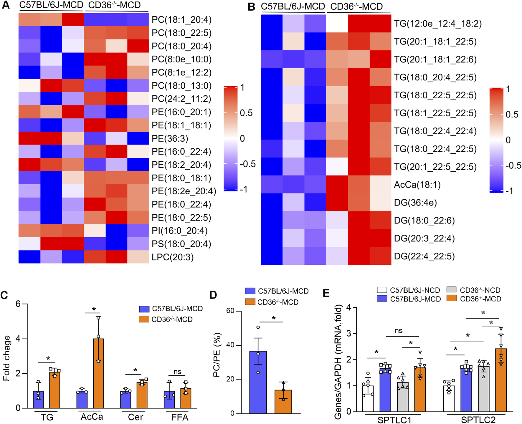 CD36 deficiency affects GP remodeling and Cer synthesis to aggravate MCD-induced MASH (A–D) Metabolomic analysis of liver samples from MCD-treated C57BL/6J and CD36−/− mice (n = 3). Relative abundance of PC, PE, PI, PS, LPC (A), TG, DG and AcCa (B) in the liver. (C) Alterations of TG, AcCa, Cer and FFA levels. (D) The ratio of total PC to PE in the liver. *P < 0.05; ns, no significance (n = 3). (E) The mRNA expression of SPTLC1 and SPTLC2 in liver tissues was determined by qPCR. *P < 0.05; ns, no significance (n = 6).