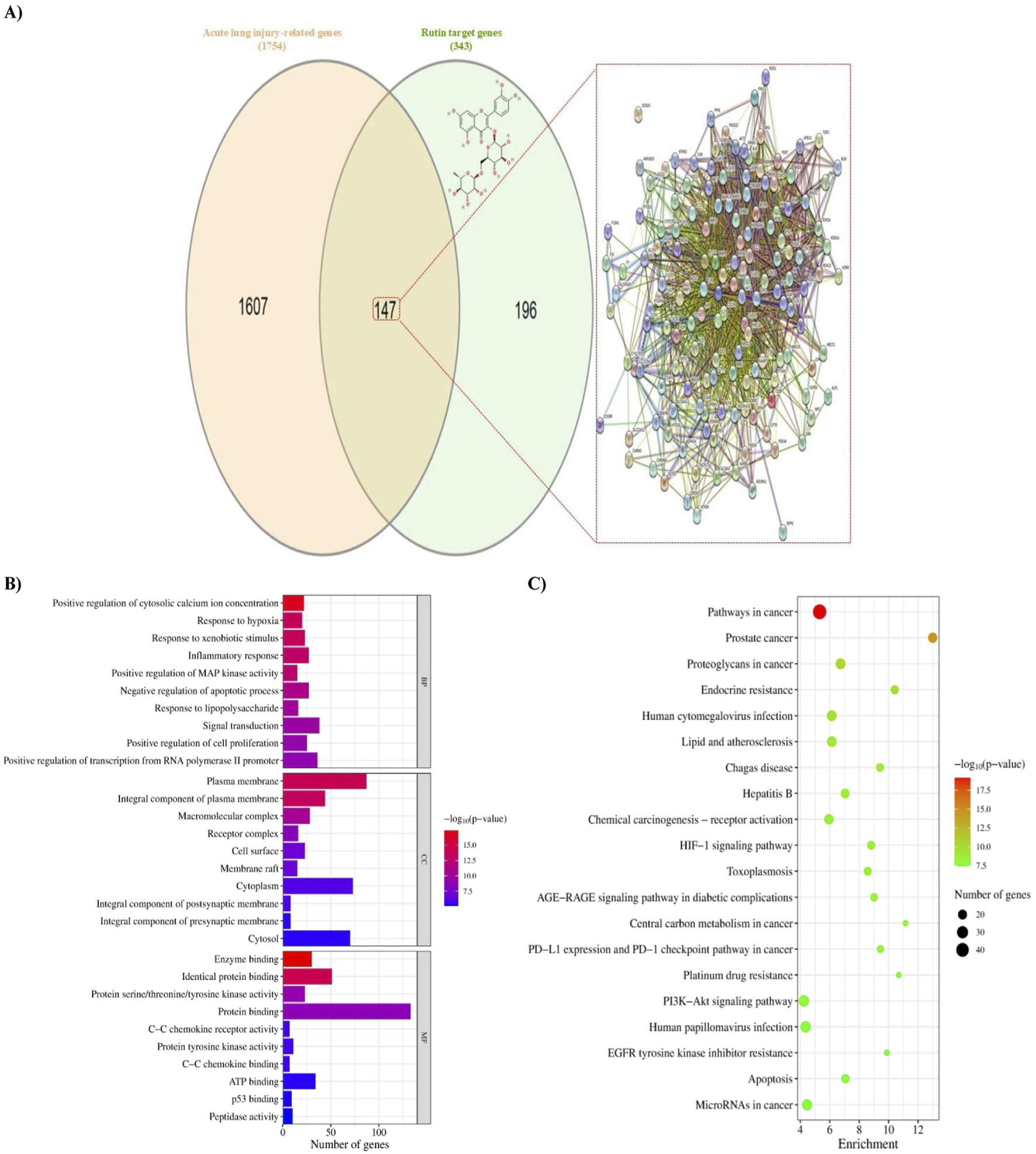 Identification of potential targets of rutin against BLM-induced acute lung injury and enrichment analyses. (A) Venn diagram of rutin targets alongside the 2D chemical structure of rutin, the acute lung injury-related genes, and the protein-protein interaction (PPI) network established from the diagram. Nodes represent proteins, and edges represent interactions. (B) Bar chart of GO terms analysis showing the top 10 terms in each of biological process (BP), cellular component (CC), and molecular function (MF). The color of the bars denotes the FDR-adjusted p-value, and the length represents the number of genes enriched in the term. (C) A Bubble chart of the KEGG pathway enrichment analysis showing the top 20 putative signaling pathways according to the FDR-adjusted p-value. The color of the circles represents the p-value, and the size represents the number of genes enriched in the pathway. The direction towards red color indicates more significance. BLM: Bleomycin.