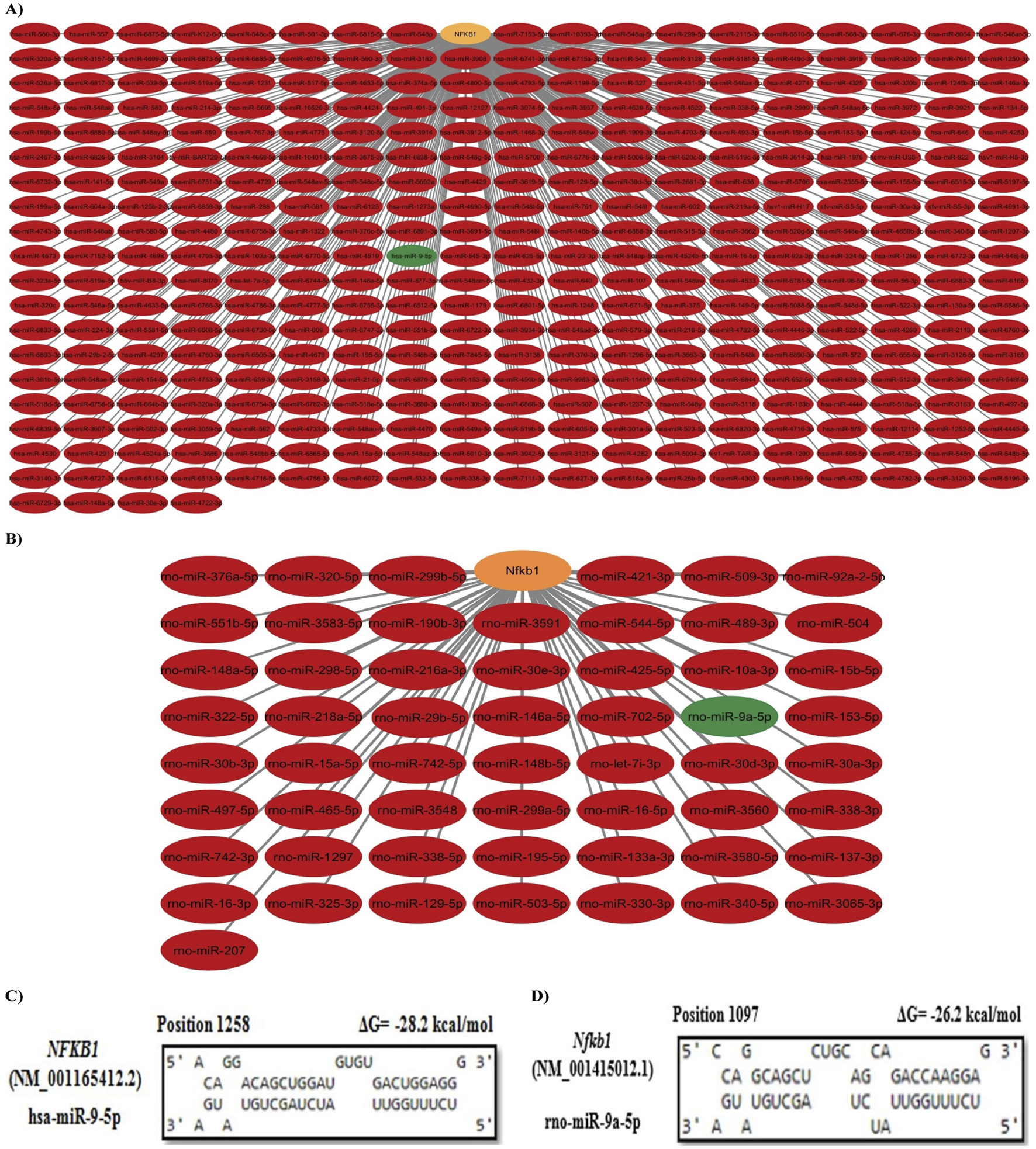 Prediction and selection of the upstream key miRNA. (A) Human miRNAs/NFKB1 interaction network. (B) Rat miRNAs/Nfkb1 interaction network. The orange node represents the target gene, and the green nodes represent shared miRNAs between humans and rats. (C, D) miRNA:mRNA duplex formation analysis. Hsa-miR-9-5p was predicted to target NFKB1 at position 1258 with ΔG = −28.2 kcal/mol, whereas rno-miR-9a-5p was predicted to target Nfkb1 at position 1097 with ΔG = −26.2 kcal/mol.