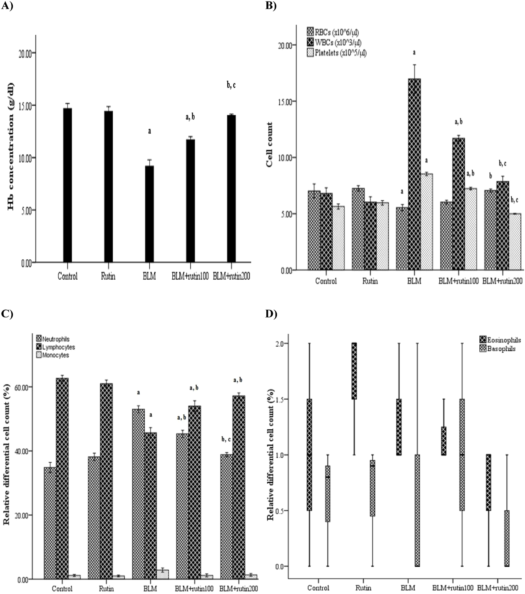 Effect of rutin on some CBC parameters. (A) Hb concentration, (B) RBCs, WBCs, and platelets count and (C, D) WBCs differential count. CBC, Complete blood count; BLM, Bleomycin; rutin100, Rutin at a dose of 100 mg; rutin200, Rutin at a dose of 200 mg; Hb, Hemoglobin; RBCs, Red blood corpuscles; WBCs, White blood cells. In multiple comparisons, ap < 0.05 vs. normal control group, bp < 0.05 vs. BLM-induced group, and cp < 0.05 vs. BLM + rutin100 group. n = 6 for each experimental group. Bar length represents the mean value for each group, with error bars depicting standard error of mean. Box plot indicates median and interquartile range.