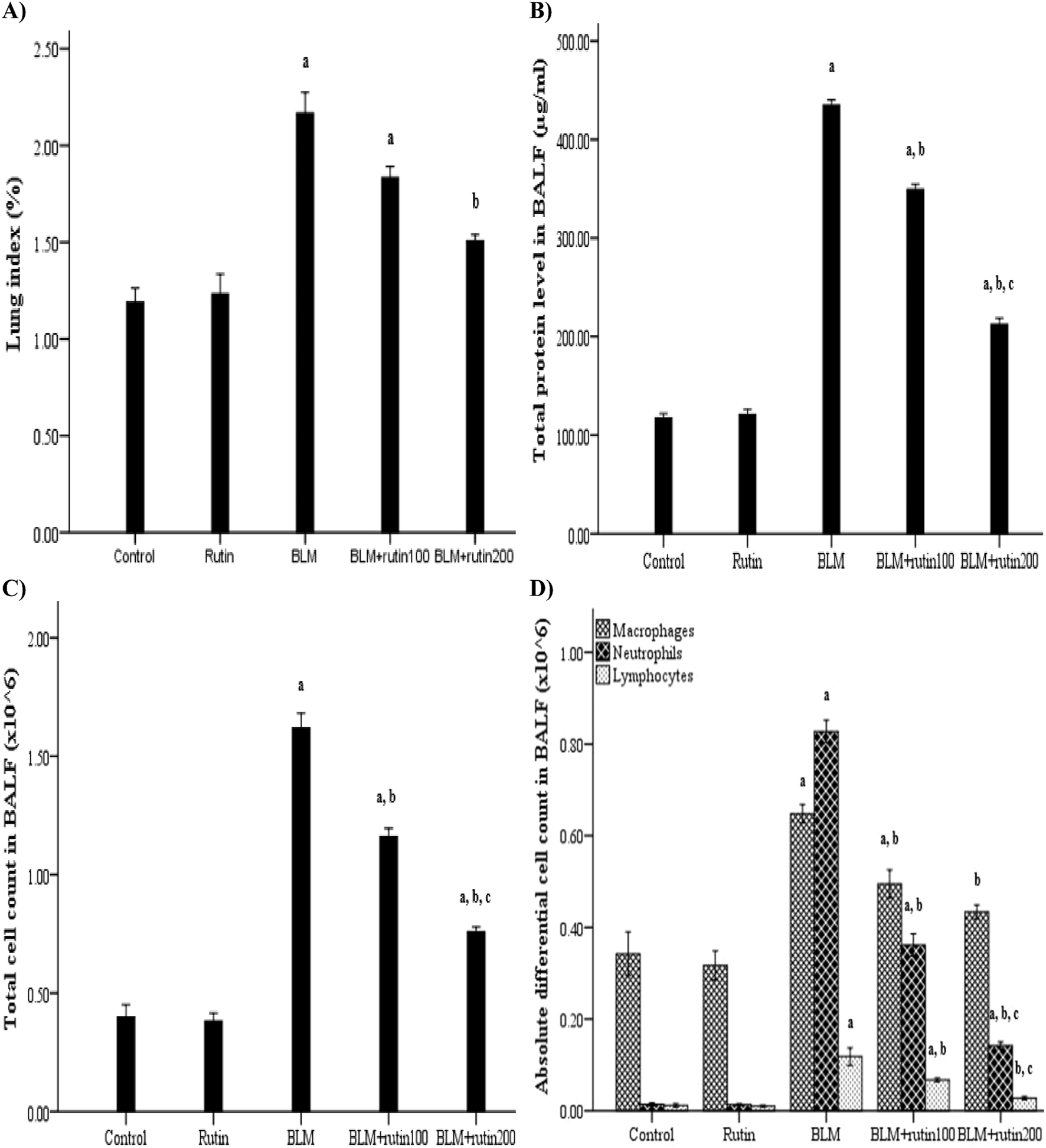 Rutin impact on (A) lung index, (B) total protein level in the BALF, (C) inflammatory cell infiltration in the BALF and (D) differential cell count in the BALF. BLM, Bleomycin; rutin100, Rutin at a dose of 100 mg; rutin200, Rutin at a dose of 200 mg; BALF, Bronchoalveolar lavage fluid. In multiple comparisons, ap < 0.05 vs. normal control group, bp < 0.05 vs. BLM-induced group, and cp < 0.05 vs. BLM + rutin100 group. n = 6 for each experimental group. Bar length represents the mean value for each group, with error bars depicting standard error of mean.