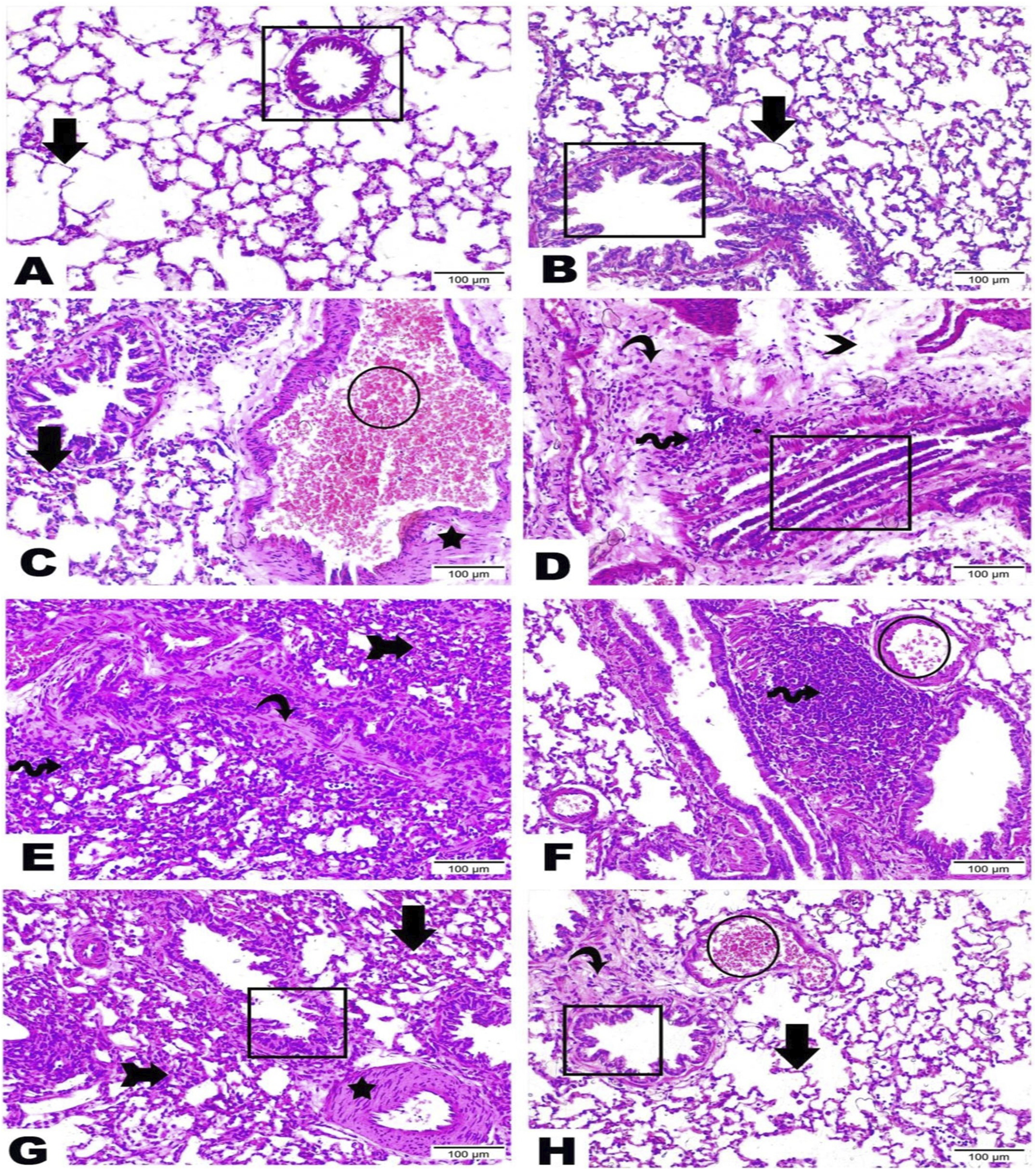 Next, thoracosternotomy was carried out to excise the lungs, which were rinsed with saline, dried with filter papers, and weighed. Then, each side was divided into two parts; one for histopathological investigations, and the other was homogenized in ice-cold phosphate-buffered saline (PBS) to form 10% homogenate for biochemical assays. For molecular analyses, a small part of each side was snap-frozen in liquid nitrogen and stored at −80°C until used.