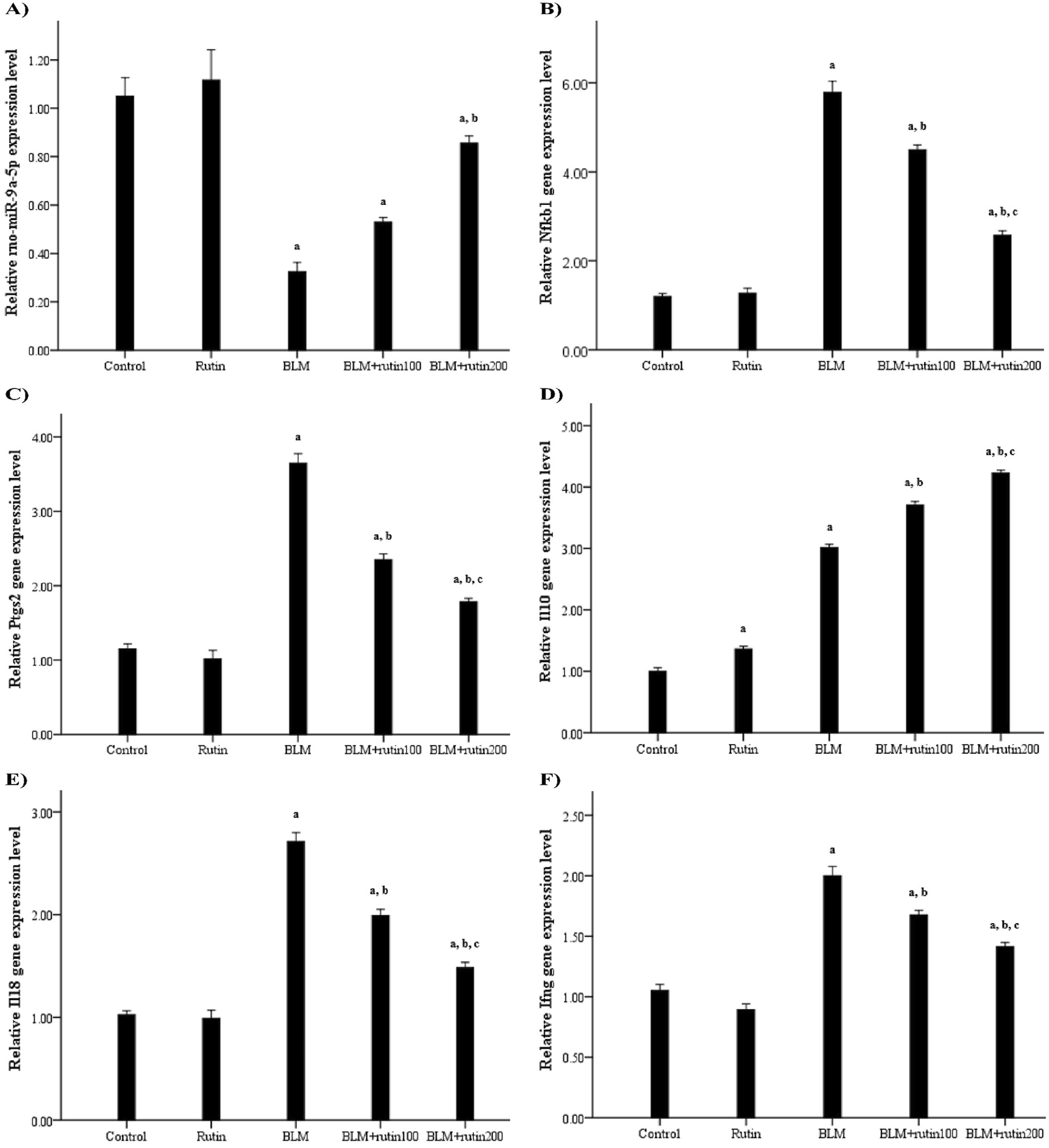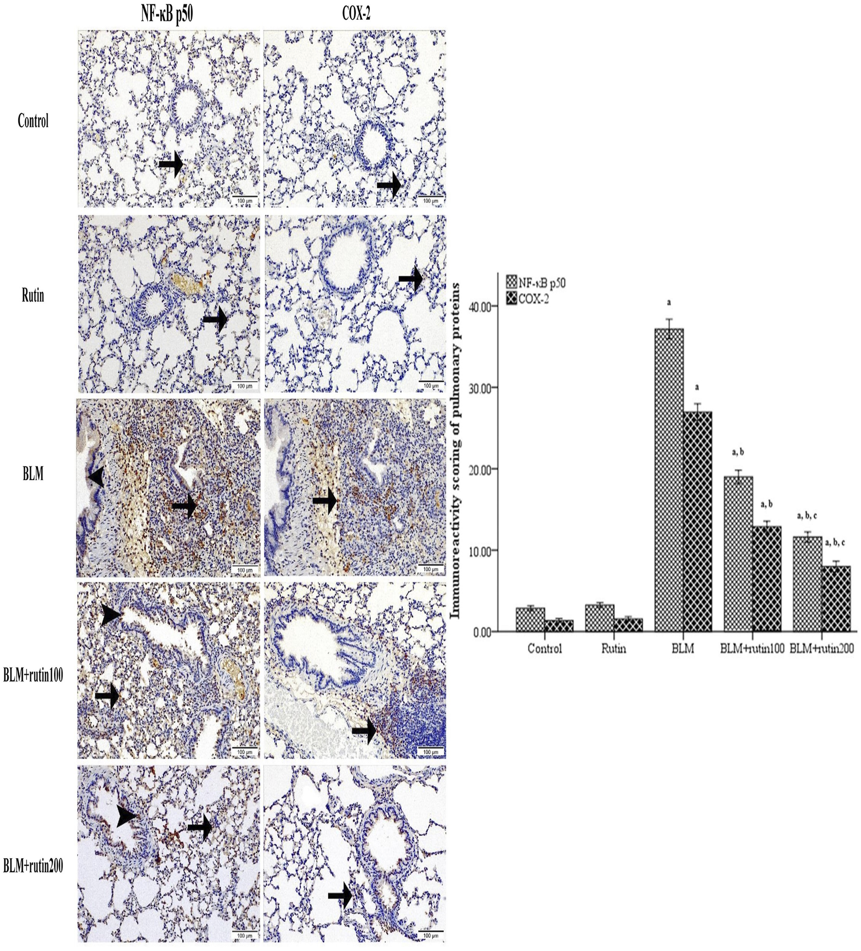 As shown in Table 1, MCP-1 and MIP-2 levels in BALF were comparable between the negative control and rutin control groups (p = 0.963 and p = 0.321, respectively). Meantime, the BLM injection significantly increased the production level of these inflammatory mediators by 5.25 and 2.89 folds, respectively, compared to the control group (p < 0.001). Nonetheless, their levels were markedly decreased upon rutin administration by 37.15% and 20.75% (p < 0.001) at a dose of 100 mg and by 70% and 50.29% (p < 0.001) at a dose of 200 mg, respectively. Once more, the high dose of rutin was more efficacious than the lower in alleviating cytokine production in BALF (p < 0.001).