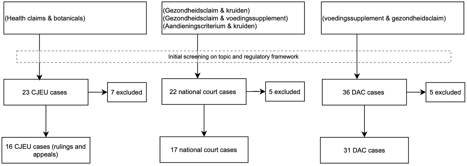 The analysis commenced with the review of the cases from the CJEU that provided (preliminary) rulings on health claims, risk assessment, and botanicals. The main issues were identified and used for the further analysis of the national and DAC cases.