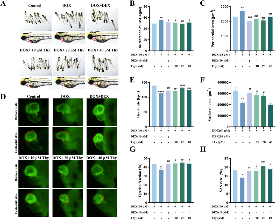 Figure 1. Effect of Thy on heart function in zebrafish with DOX-induced cardiomyopathy. (A) Morphological diagram of the zebrafish in each group, the red dotted box represents the heart area; (B) Statistical graph of the SV‒BA distance in zebrafish; (C) Statistical graph of the pericardial area in zebrafish; (D) Fluorescence in the zebrafish heart, the red dotted box represents the zebrafish ventricle; (E) Graph of the heart rate in zebrafish; (F) Graph of the stroke volume in zebrafish; (G) Graph of the ejection fraction in zebrafish; (H) Graph of the SAS rate in zebrafish. Compared with the blank group, ****p < 0.0001; Compared with the DOX model group, #p < 0.05, ##p < 0.01, ###p < 0.001, ####p < 0.0001.