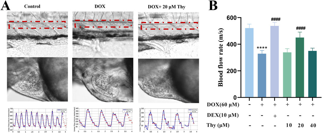 Figure 2. Effect of Thy on the blood flow rate in zebrafish with DOX-induced cardiomyopathy. (A) Schematic diagram of blood flow in the tail artery and heart of zebrafish; the red line indicates the artery; (B) Statistical graph of blood flow velocity in the tail artery of zebrafish. Compared with the blank group, ****p < 0.0001; Compared with the DOX model group, ####p < 0.0001.