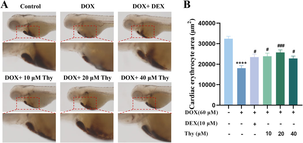 Twenty-four hours after drug administration, erythrocyte staining of the hearts of the zebrafish in each group was performed; the results are shown in Figure 3A. Compared with that in the blank control group, the area of erythrocyte staining in the DOX-treated zebrafish was significantly lower. Compared with that in the DOX model group, the area of staining area in the zebrafish in the DEX-positive control group and the Thy-treated group was significantly greater; 20 μM Thy had the best effect against DOX-induced myocardial ischemia (Figure 3B).