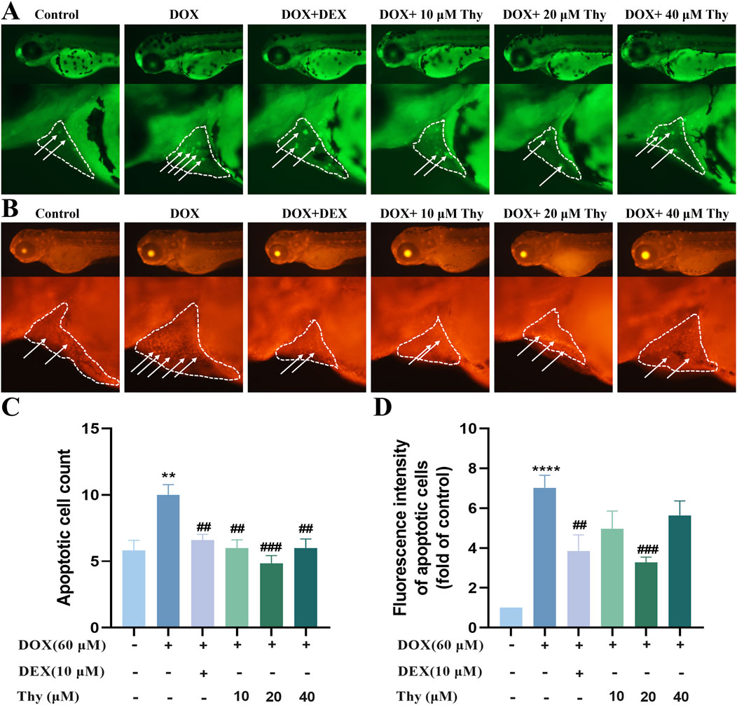 Figure 4. Effect of Thy on the apoptosis of cardiomyocytes in zebrafish with DOX-induced cardiomyopathy. (A) AO staining. The white arrowhead indicates cell apoptosis in the heart region, and the white line indicates pericardial edema; (B) TUNEL staining. The white arrowhead indicates cell apoptosis in the heart region, and the white line indicates pericardial edema; (C) Statistical graph of apoptotic cell numbers; (D) Statistical graph of fluorescence intensity of apoptotic cells. Compared with the blank group, **p < 0.01, ****p < 0.0001; Compared with the DOX model group, ##p < 0.01, ###p < 0.001.