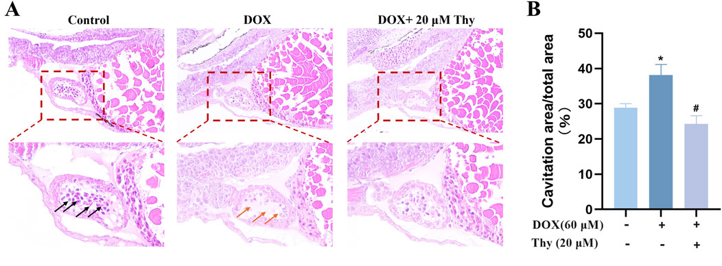 Figure 5. Effect of Thy on the morphology of heart tissue in zebrafish with DOX-induced cardiomyopathy. (A) Black arrows indicate normal intercellular gaps and tightly arranged myocardial cells; Orange arrows indicate large intercellular gaps and disordered cardiomyocytes. (B) Statistical graph of heart vacuolation in zebrafish. Compared with the blank group, *p < 0.05; Compared with the DOX model group, #p < 0.05.