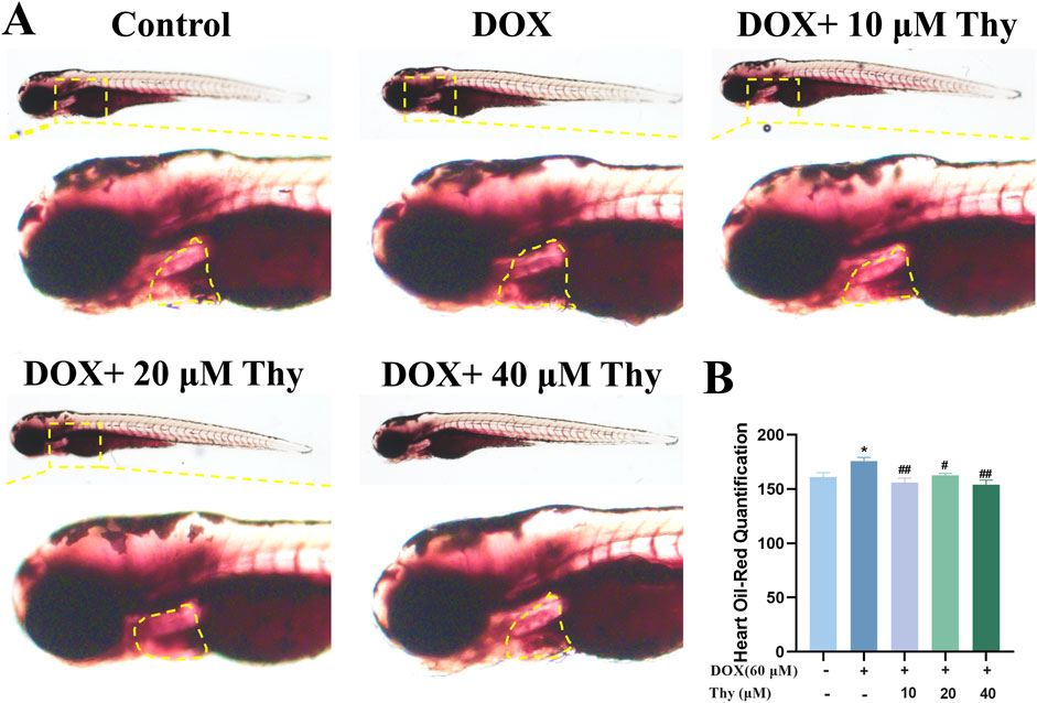 Figure 6. Effect of Thy on lipids in the hearts of zebrafish with DOX-induced cardiomyopathy. (A) Oil red O-stained zebrafish; the yellow dotted line indicates the heart region; (B) Statistical graph of the intensity of the Oil red O staining in zebrafish. Compared with the blank group, *p < 0.05; Compared with the DOX model group, #p < 0.05, ##p < 0.01.