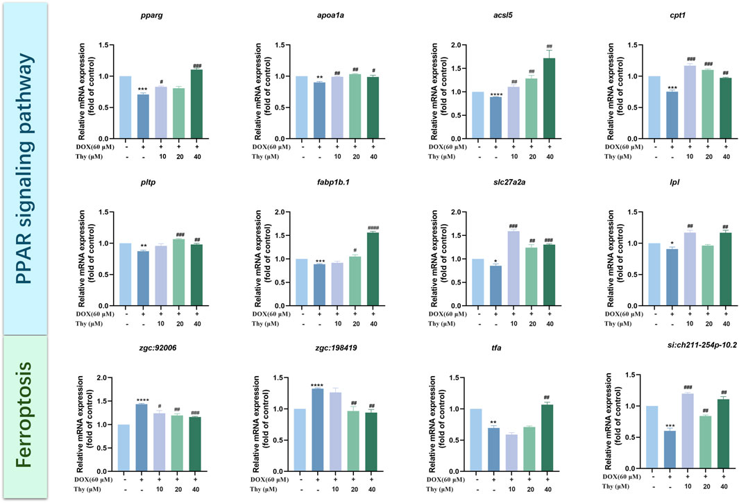 In summary, this study revealed that Thy has a significant effect on DOX-induced cardiomyopathy. The mechanism of action of Thy may involve the activation of the PPAR signaling pathway to reduce lipid accumulation in the heart of zebrafish, thereby alleviating ferroptosis. This study provides a theoretical basis and an experimental basis for the development of novel drugs against DOX-induced cardiomyopathy.