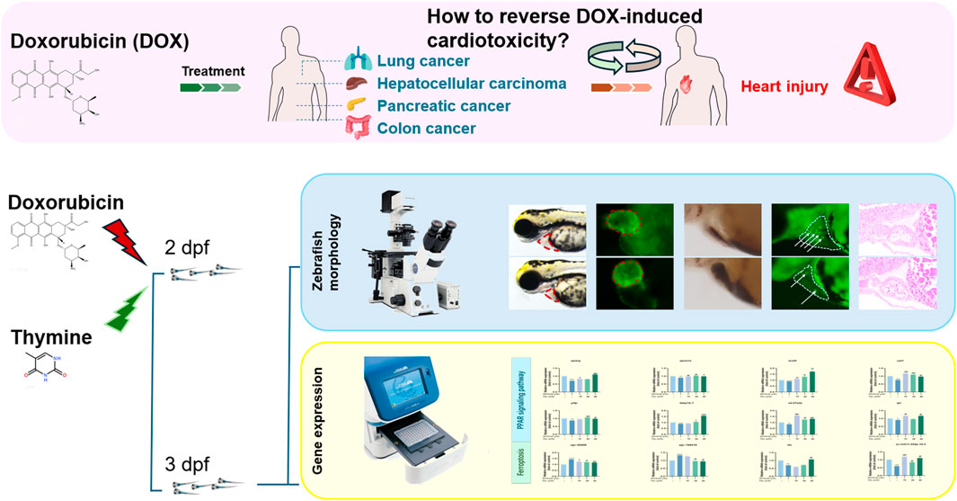 Results: The results indicated that Thy effectively relieved DOX-induced pericardial edema; reversed the effects of DOX on heart rate, stroke volume, SAS rate, ejection fraction, and blood flow velocity; and relieved DOX-induced myocardial ischemia, myocardial cell apoptosis and pathological structural changes in heart tissues. The RT‒qPCR results revealed that Thy regulated the mRNA expression levels of genes related to the PPAR signaling pathway and ferroptosis pathway (such as pparg, apoa1a, acsl5, pltp, and tfa).