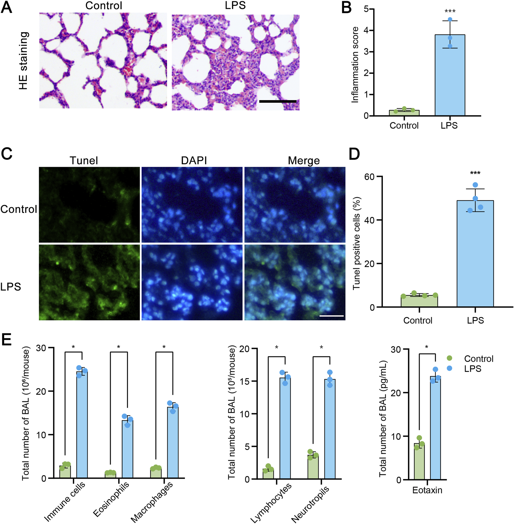 LPS administration induces to acute lung injury (ALI). (A) Hematoxylin and eosin (HE) staining of transverse lung sections from rats in the control and LPS-treated groups. (B) Quantification of the inflammatory response based on HE staining (n = 3). (C) TUNEL staining of transverse lung sections from the control and LPS-treated groups. (D) The number of TUNEL-positive cells relative to the total cells in lung tissue from the control and LPS-treated groups (n = 4). (E) Assessment of total cells, neutrophils, lymphocytes, macrophages, eosinophils, and Eotaxin levels in bronchoalveolar lavage fluid (BAL) by Wright-Giemsa (n = 3). Scale bars = 100 μm. Data are presented as mean ± SD. *P < 0.05 vs control; ***P < 0.001 vs control.
