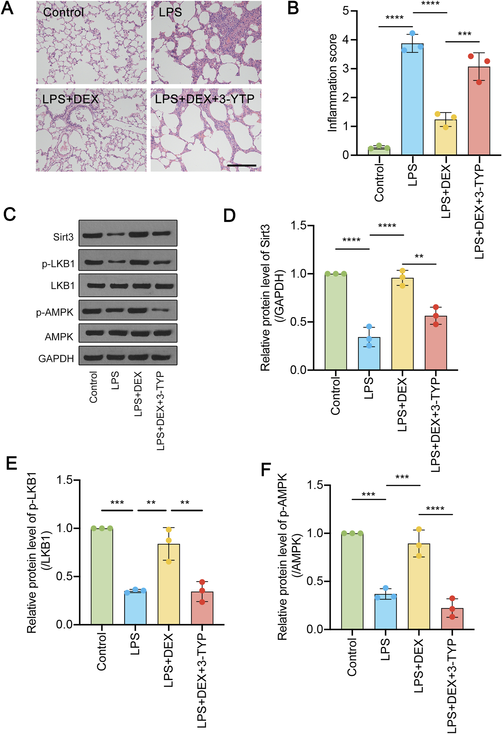 Dexmedetomidine (DEX) regulates the SIRT3/LKB1/AMPK signaling pathway in LPS-induced ALI. (A) HE-staining of transverse lung sections from rats in the control and LPS-treated groups, LPS + DEX, LPS + DEX+3-YTP (inhibitor of SIRT3) was performed. (B) The inflammation score was quantified for (A). (C) The protein levels of total SIRT3, phosphorylated and total LKB1 and phosphorylated and total AMPK were determined. (D–F) The quantified data were shown. The data are represented as mean ± SD (n = 3). **P < 0.01; ***P < 0.001; ****P < 0.0001.