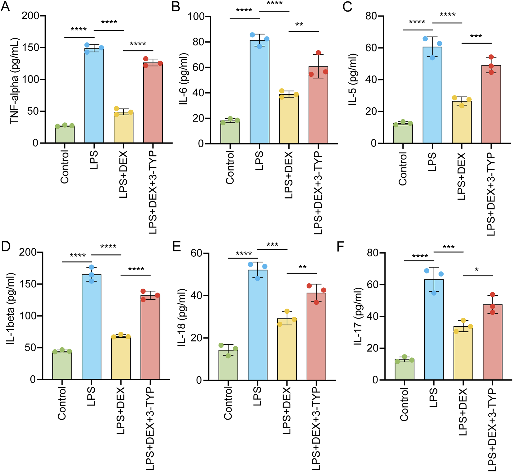 To investigate whether the pro-inflammatory response evoked by LPS could be mitigated by DEX through the SIRT3 signaling pathway, we administered rats with LPS, DEX, or the SIRT3 inhibitor 3-TYP. We then assessed the levels of pro-inflammatory cytokines in their serum. As depicted in Figure 4, exposure to LPS markedly upregulated the serum levels of TNF-α (Figure 4A), IL-6 (Figure 4B), IL-5 (Figure 4C), IL-1β (Figure 4D), IL-18 (Figure 4E), and IL-17 (Figure 4F). However, the administration of DEX notably attenuated these cytokine levels, an effect that was nullified by the additional treatment with 3-TYP (Figure 4). Collectively, these findings indicate that pharmacological inhibition of the SIRT3 pathway undermines the protective role of DEX in LPS-induced inflammation in ALI.