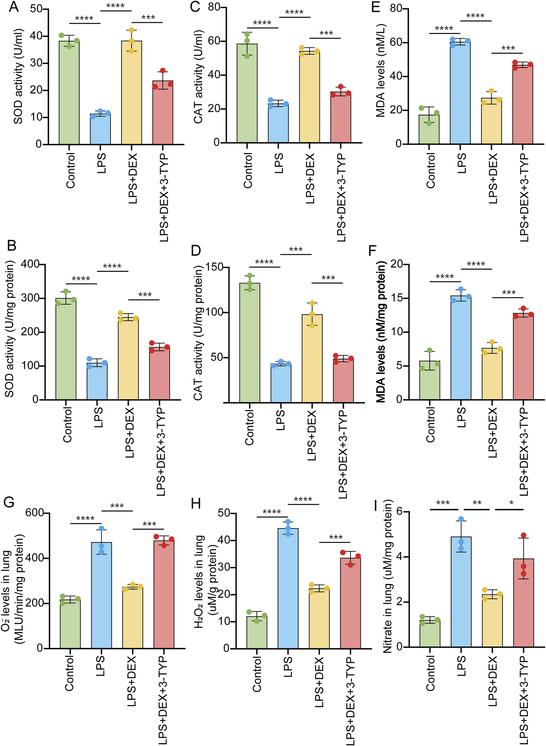 Inhibition of SIRT3 signaling abolishes the protective effect of DEX during oxidative stress induced by LPS. Rats were administered as in Figure 3. The collected samples were subjected to oxidative stress detection. SOD activity (A,B), CAT activity (C,D) and MDA (E,F) levels measured in the serum or in the lung tissue samples of LPS-treated rats, with or without DEX or 3-YTP. O2- (G) and H2O2 (H), and nitrate levels (I) in the LPS-induced lung tissue samples were measured. The data are presented as mean ± SD (n = 3). *P < 0.05; **P < 0.01; ***P < 0.001; ****P < 0.0001.