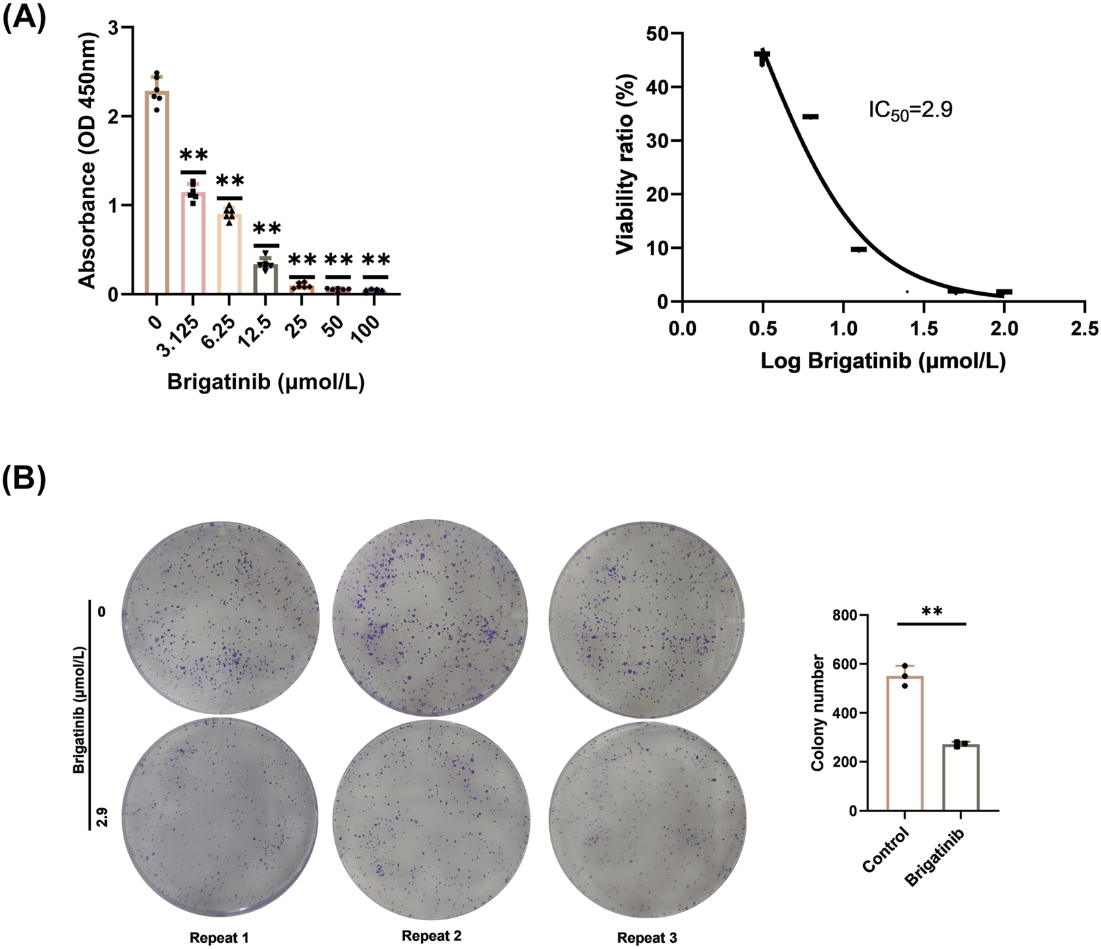 Brigatinib could dramatically inhibit the growth and proliferation of HaCaT cells. (A) CCK8 assay was performed to identify the growth rate of HaCaT cells. Data are shown as mean ± SD, n = 6 (*P < 0.05, **P < 0.01) (B) Brigatinib decreased the colony-forming ability of the HaCaT cell. Data are shown as mean ± SD, n = 3 (**P < 0.01).