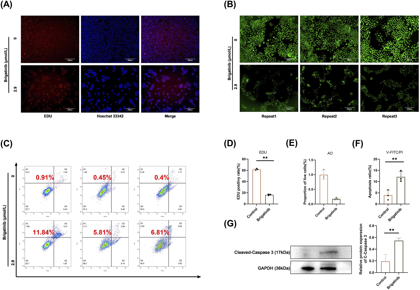 Brigatinib could induce the apoptosis of HaCaT cells. (A) Decreased number of EdU positive HaCaT cells was shown after brigatinib treatment. (B) Fluorescence of apoptosis induced by brigatinib on HaCaT cells using AO staining. (C) Brigatinib could significantly increase the proportion of apoptotic HaCaT cells. (D) EdU positivy rate of HaCaT cells. Data are shown as mean ± SD, n = 3 (**P < 0.01) (E) Proportion of live cells in AO staining. Data are shown as mean ± SD, n = 3 (**P < 0.01) (F) Apoptosis ratio of HaCaT cells. Data are shown as mean ± SD, n = 3 (**P < 0.01) (G) Western blots analysis of Cleaved-Caspase three in HaCaT cells after brigatinib treatment. Data are shown as mean ± SD, n = 3 (**P < 0.01).