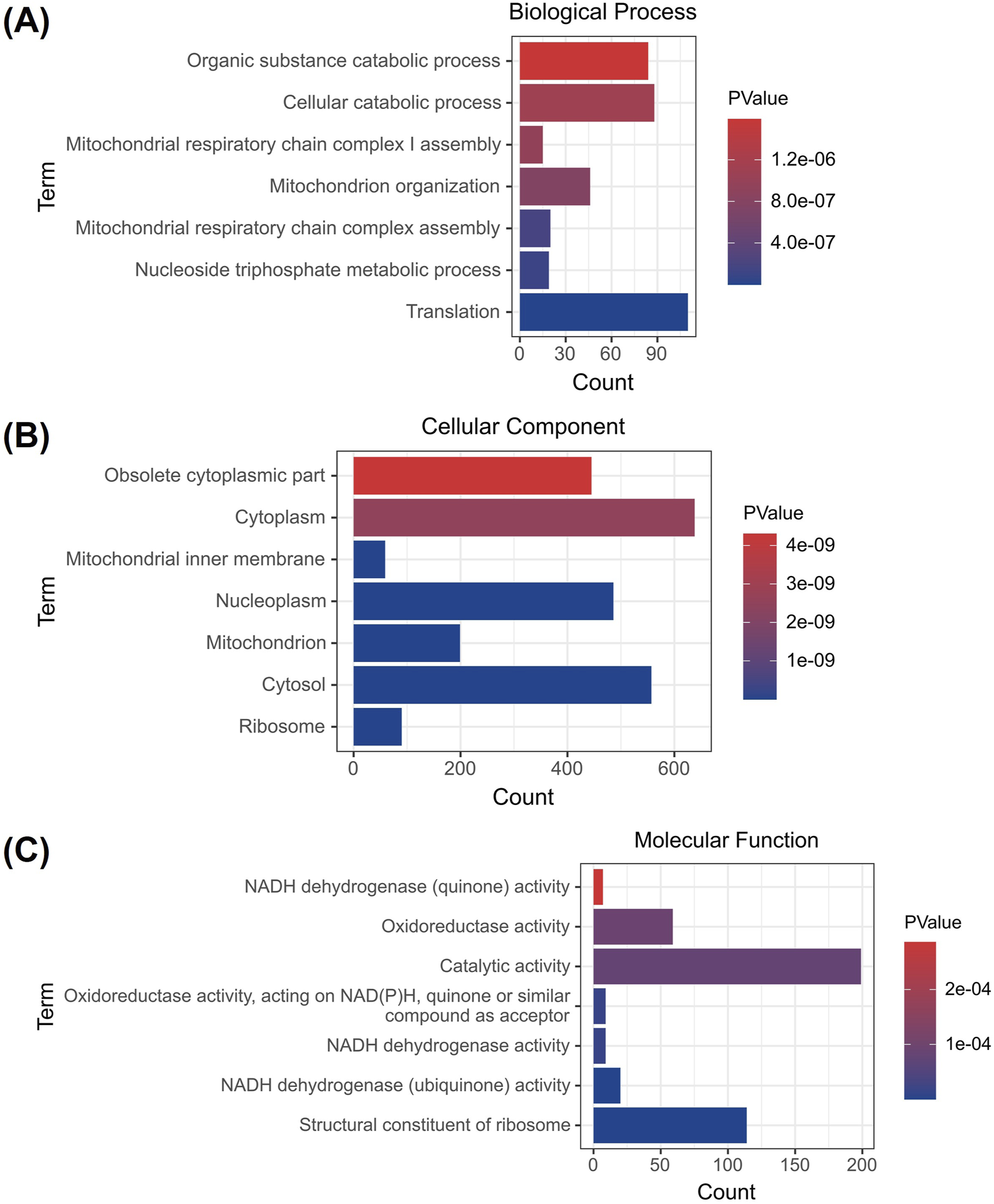 GO analysis of the HaCaT cells of DEGs were conducted to predict DEGs functions and molecular interactions among genes after brigatinib treatment. GO analyses covered three domains: biological process, cellular component and molecular function. The top seven enriched GO terms in biological process, cellular component and molecular function after brigatinib treatment were shown in Figures 4A–C and Supplementary Table S2. Significantly enriched GO terms for biological processes included organic substance catabolic process, cellular catabolic process and mitochondrial respiratory chain complex I assembly. In terms of cellular component, obsolete cytoplasmic part, cytoplasm and mitochondrial inner membrane were significantly enriched. Finally, for the molecular functions category, NADH dehydrogenase (quinone) activity, oxidoreductase activity and catalytic activity were significantly enriched after brigatinib treatment.