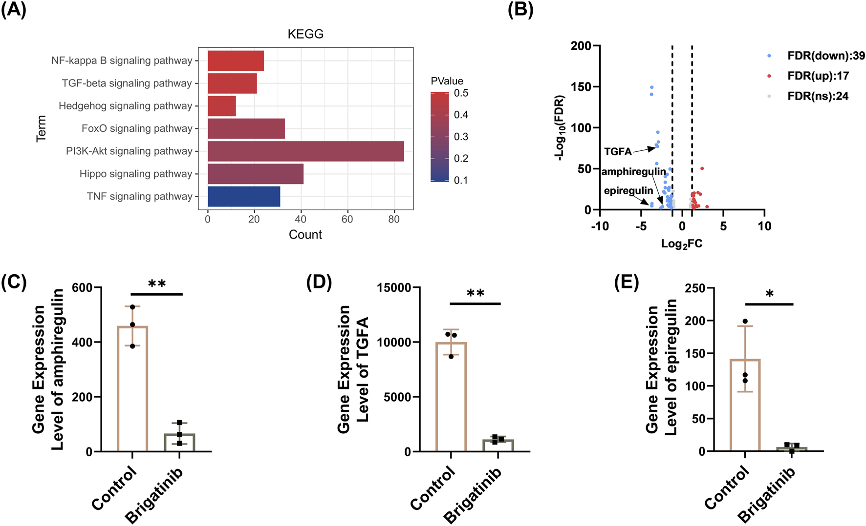 KEGG pathway analysis of differentially expressed genes after brigatinib treatment in HaCaT cells. (A) Top 7 KEGG pathways of KEGG enrichment analysis in HaCaT cells after brigatinib treatment. (B) The volcano plot of DEGs in PI3K/AKT pathway after brigatinib treatment in HaCaT cells, where red represents 17 upregulated genes, blue represents 39 downregulated genes, and gray represents 24 genes with insignificant differences (Set threshold FDR <0.05 and |fold change| > 2) (C–E) Gene differential expression analysis of amphiregulin, epiregulin, and TGFA in HaCaT cells after brigatinib treatment. Data are shown as mean ± SD, n = 3 (*P < 0.05, **P < 0.01).