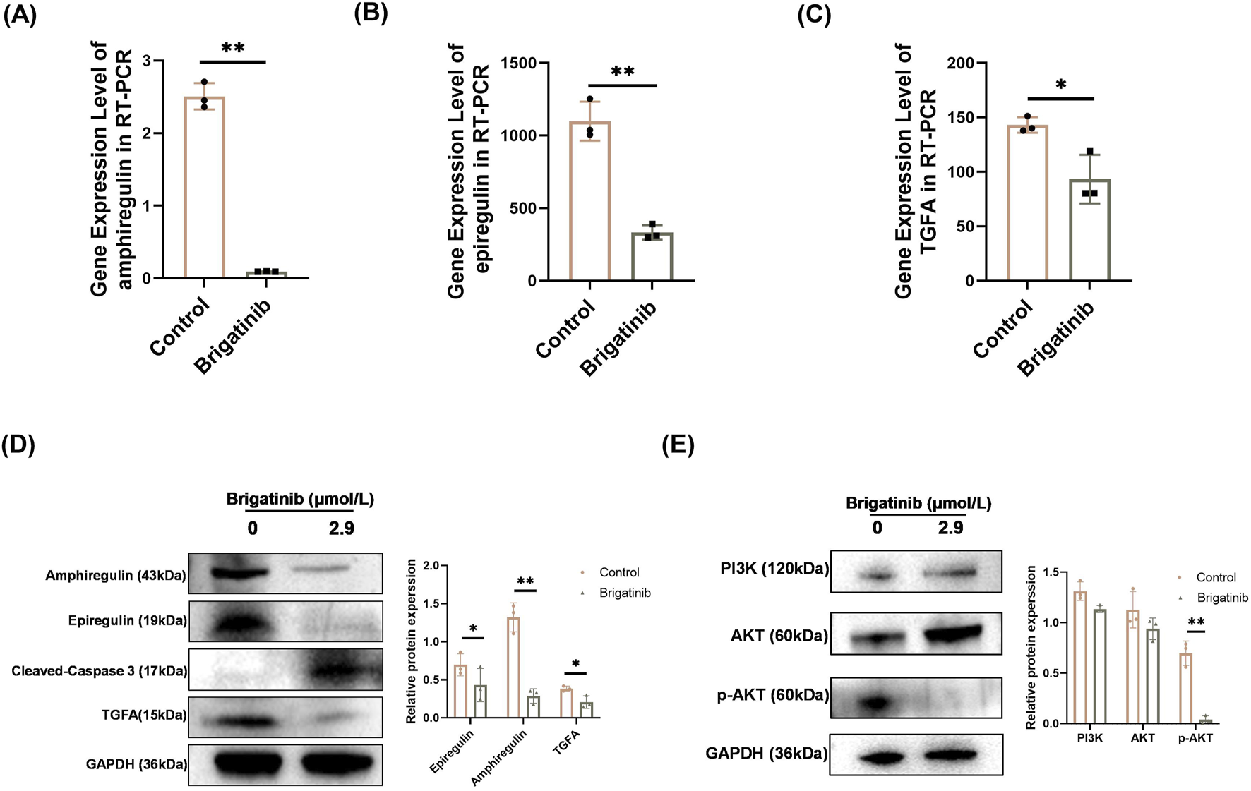 Brigatinib inhibited the PI3K/AKT pathway of HaCaT cells and decreasing amphiregulin, epiregulin, and TGFA expressions. (A–C) qRT-PCR analysis of amphiregulin, epiregulin, and TGFA in HaCaT cells after brigatinib treatment. Data are shown as mean ± SD, n = 3 (*P < 0.05, **P < 0.01) (D) Western blots analysis of amphiregulin, epiregulin, TGFA in HaCaT cells after brigatinib treatment. Data are shown as mean ± SD, n = 3 (*P < 0.05, **P < 0.01) (E) Western blots analysis of PI3K, AKT and p-AKT in HaCaT cells after brigatinib treatment. Data are shown as mean ± SD, n = 3 (**P < 0.01).