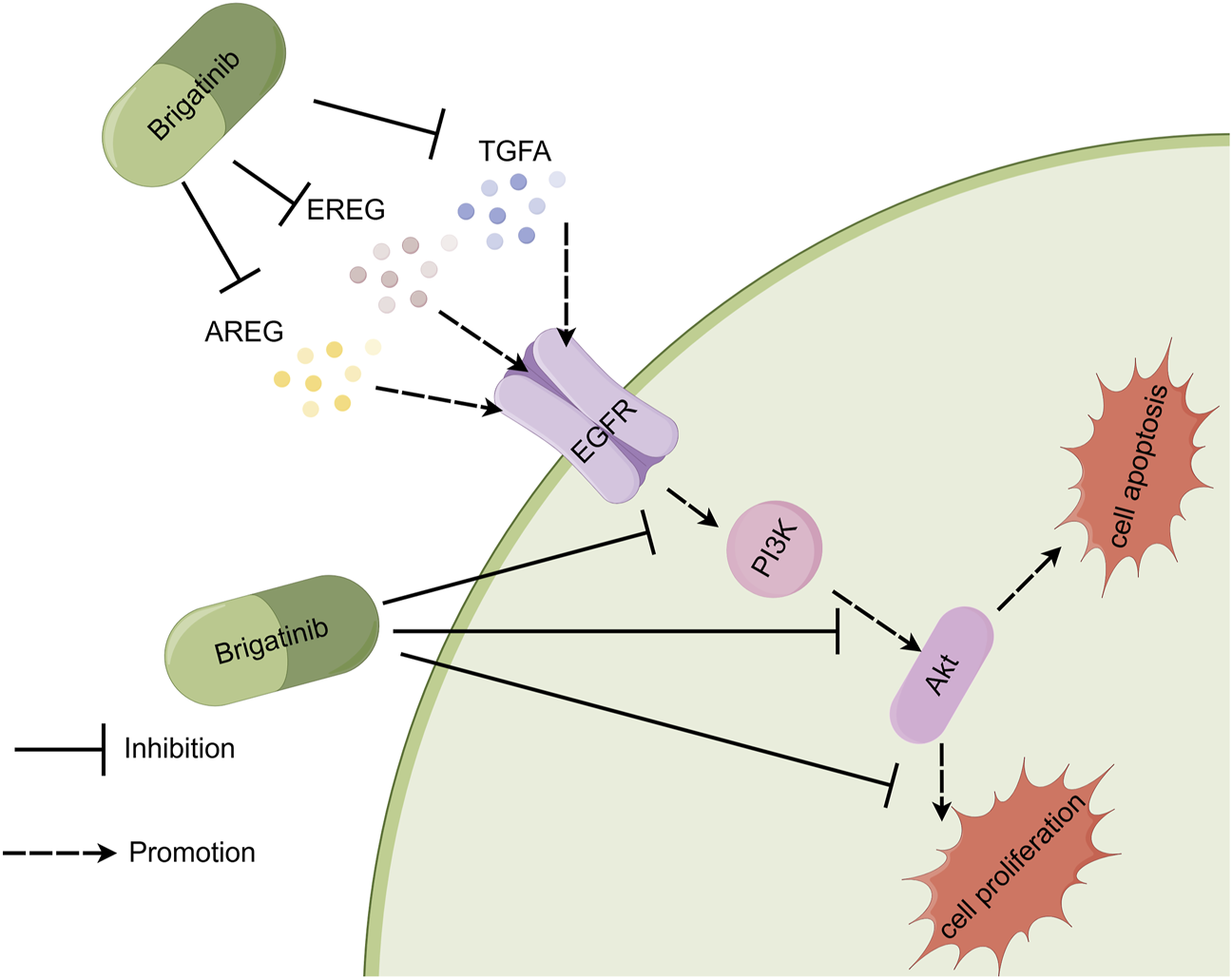 Proposed mechanism of brigatinib in inhibiting proliferation and promoting apoptosis on HaCaT cells. Brigatinib induced HaCaT cells damage by downregulating amphiregulin, epiregulin, and TGFA expressions while also inhibiting PI3K/AKT signaling pathways. The figure was drawn by Figdraw.