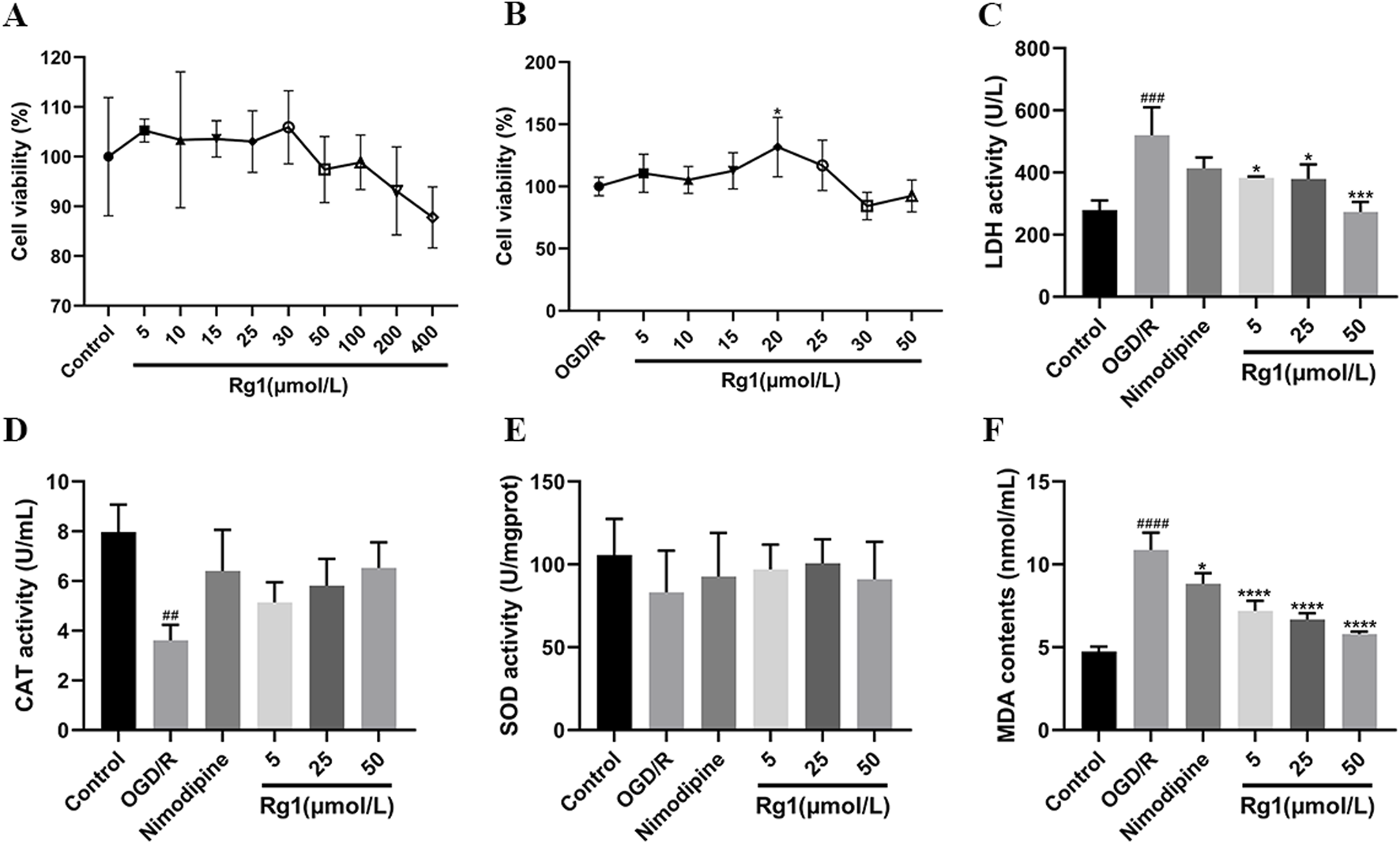 (A) Results of Rg1 safe concentration screening. (B) Results of Rg1 effective concentration screening. (C) Effect of Rg1 on LDH in OGD/R-injured neuronal cells (n = 3). (D) Effect of Rg1 on CAT in OGD/R-injured neuronal cells (n = 3). (E) Effect of Rg1 on SOD in OGD/R-injured neuronal cells (n = 3). (F) Effect of Rg1 on MDA in OGD/R-injured neuronal cells (n = 3). ## compared with control group, P ≤ 0.01; ### compared with control group, P ≤ 0.001; #### compared with control group, P ≤ 0.0001; * compared with OGD/R group, P ≤ 0.05; *** compared with OGD/R group, P ≤ 0.001; **** compared with OGD/R group, P ≤ 0.0001.