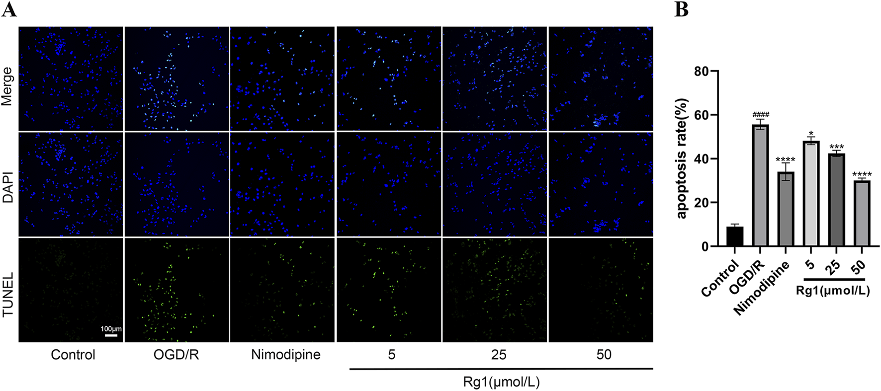 TUNEL staining revealed significant apoptosis in HT22 cells following OGD/R treatment. However, both Rg1 and nimodipine effectively inhibited apoptosis in OGD/R-injured HT22 cells, with 50 μmol/L Rg1 exhibiting the most pronounced inhibitory effect on cell apoptosis (Figures 5A, B).