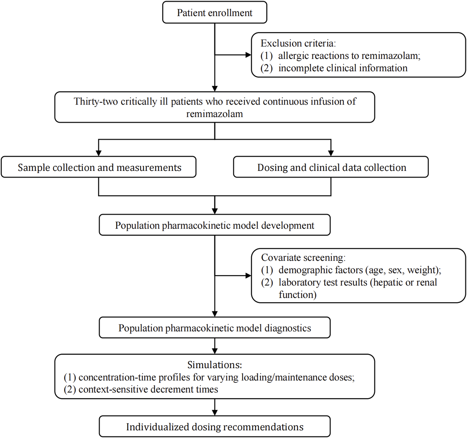This study was conducted from April 2022 to December 2022 in the Department of Critical Care Medicine, Maoming People’s Hospital. The research was performed according to the World Medical Association Declaration of Helsinki and approved by the local ethics committee of Maoming People’s Hospital (No. PJ2021MI-K009-01). Patients who received remimazolam for sedation in the ICU were prospectively recruited to the study. The inclusion criteria were: (i) patients aged from 18 to 85 years who were administered remimazolam through an intravenous micropump; and (ii) patients or guardians gave acceptance for multiple blood collections during the study. Patients who had allergic reactions to remimazolam or incomplete clinical information were excluded. All patients or their legally authorized representatives provided written informed consent for the procedures.