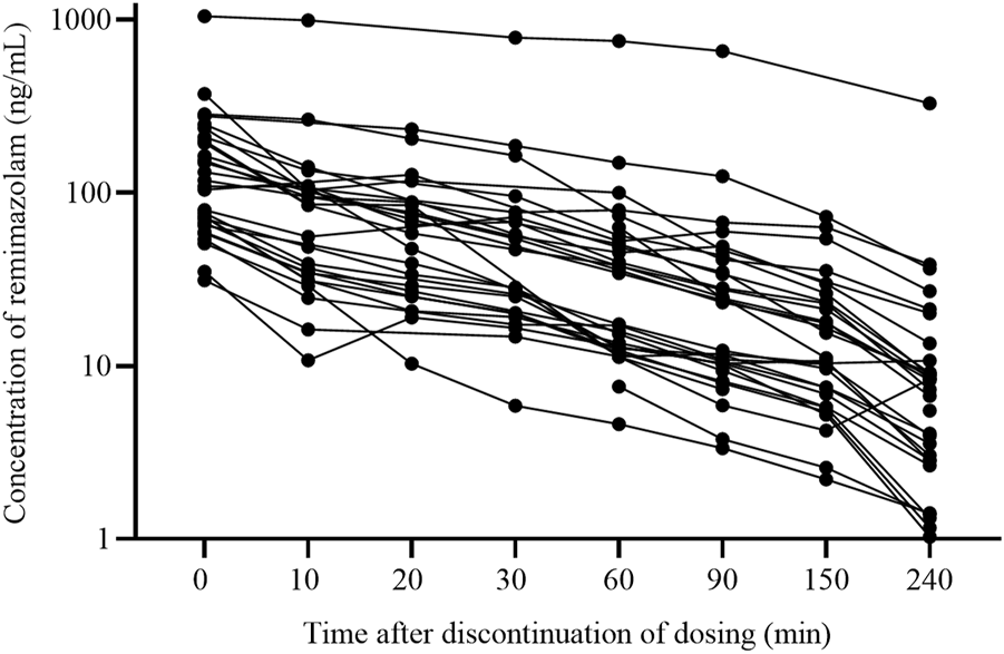 The plasma concentration-time curves of remimazolam after discontinuing infusion (n = 32).