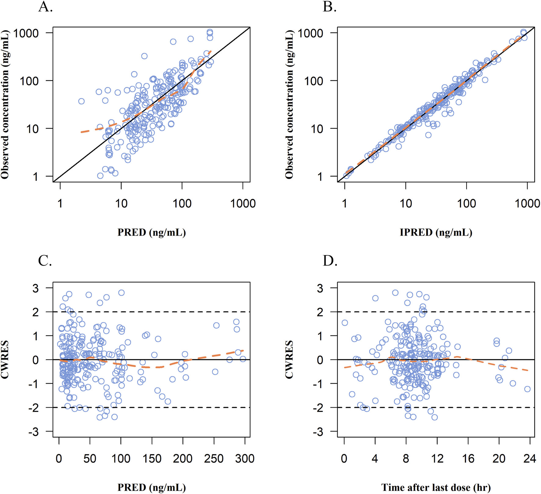 Prediction-based model diagnostic plots illustrated the goodness of fit in a model by presenting the conformance between the observation and the population prediction (PRED) or the individual prediction (IPRED). Diagnostic plots of conditional weighted residuals (CWRES) vs time or PRED were used to estimate the prediction error. The non-parameter bootstraps were resampled 1,000 times to generate the datasets which were used to assess the accuracy and the stability of the model estimates. The distributional characteristics of the observed and the simulated data were graphically displayed in pcVPC. NPDE was based on 1,000 simulations and the model evaluated using the Wilcoxon signed rank test, Fisher’s variance test or Shapiro-Wilks test when appropriate.