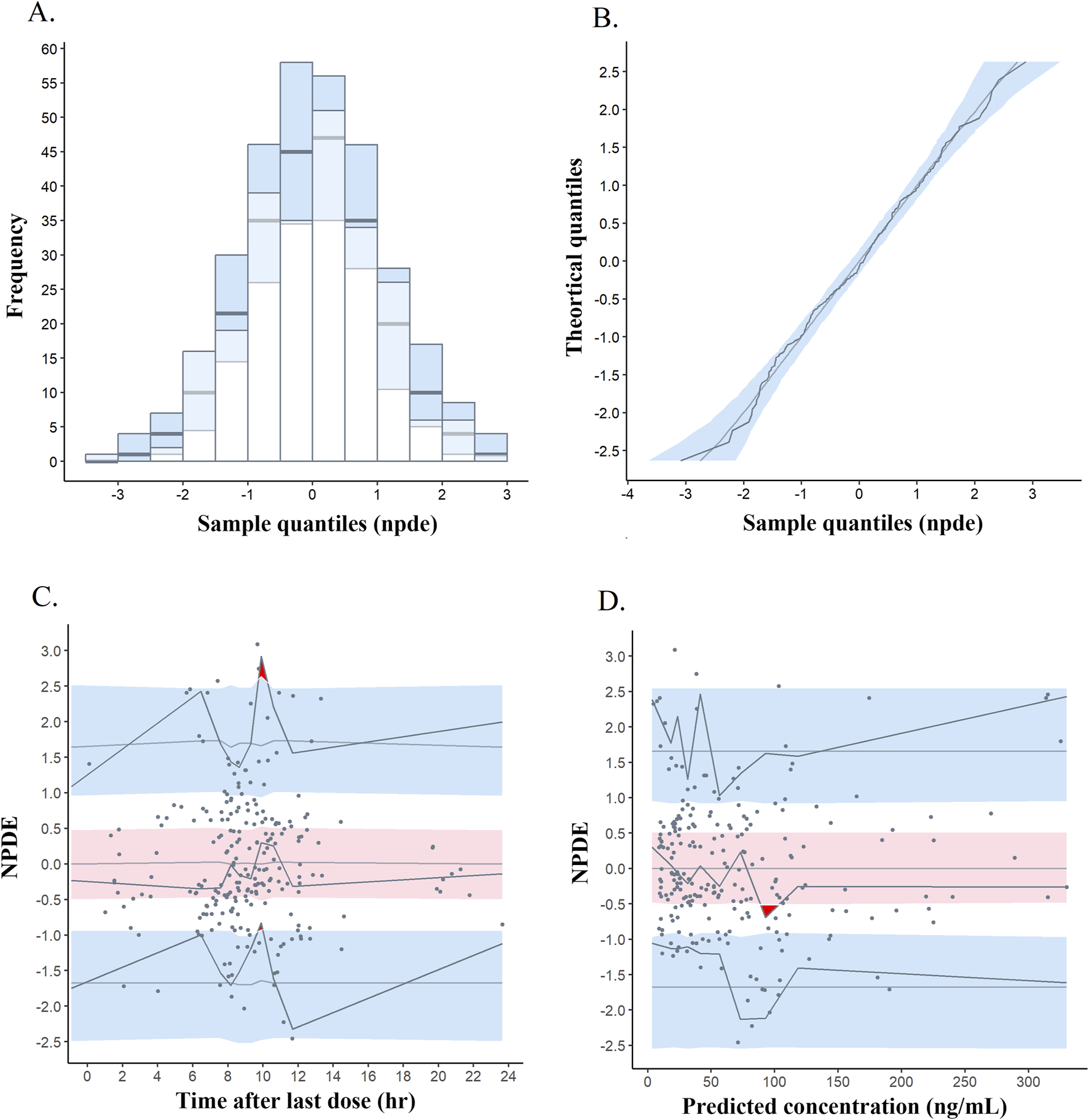 The diagnostic plots, bootstraps, prediction-corrected visual predictive check (pcVPC) and normalized prediction distribution error (NPDE) were used to comprehensively evaluate the models in this study.