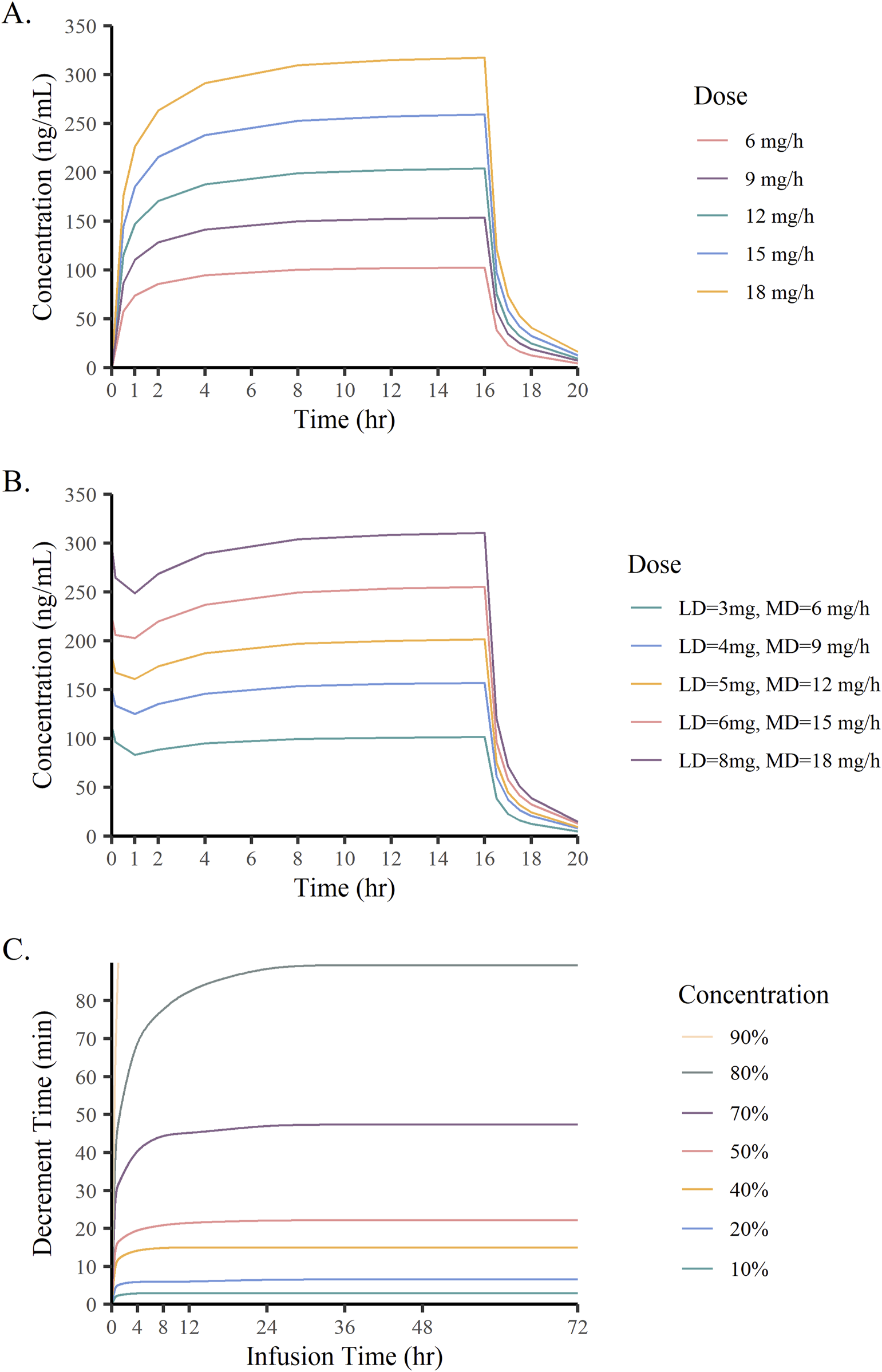 Monte Carlo simulations were conducted using the final model to generate data from 1,000 subjects to investigate the relationship between the remimazolam dose and the plasma concentration. In combination with covariates, concentration-time curves were calculated under different loading doses (3–8 mg/min) of 1-min duration and maintenance doses (6–18 mg/h) of up to 16 h. Context-sensitive decrement times (CSDTs) for remimazolam were estimated from population predicted values. The time to 10%–90% decrement in the concentrations of remimazolam between 0.5 h and 72 h by continuous infusion at a maintenance dose of 12 mg/h were simulated.