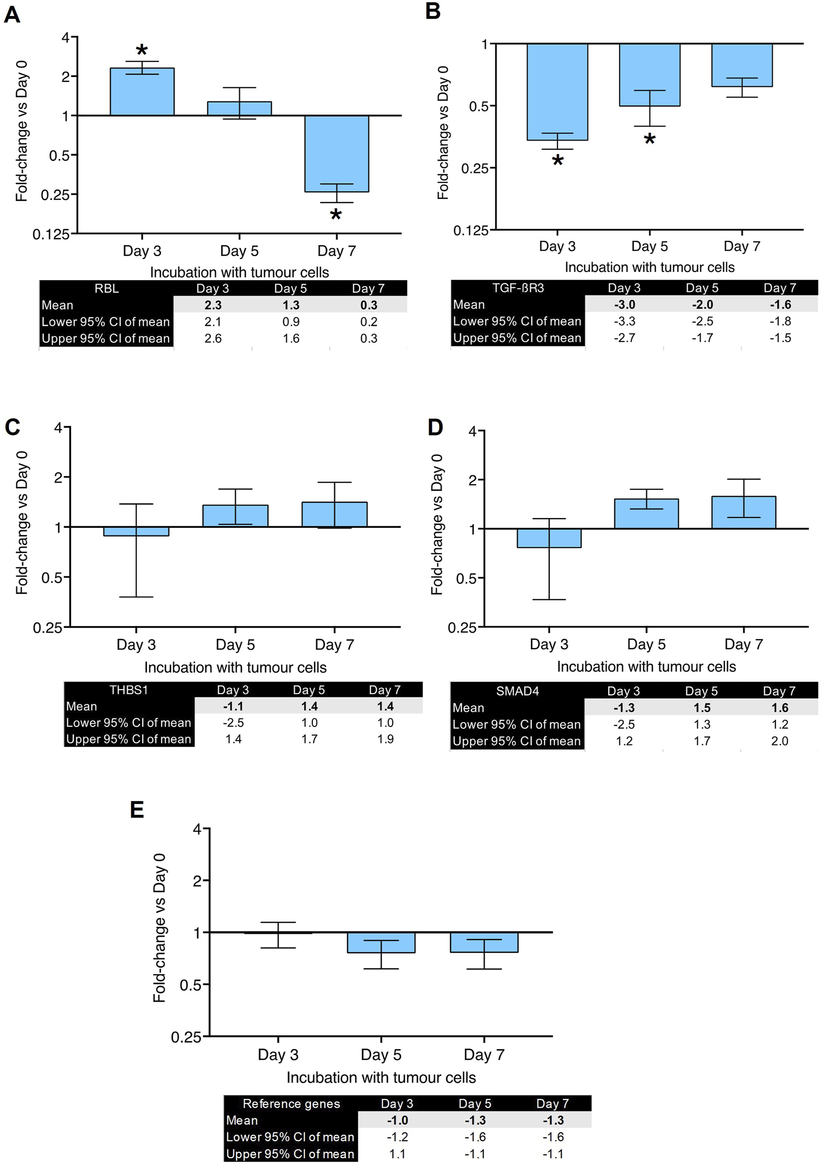 Gene expression changes in co-culture of human primary lung fibroblasts with MDA-MB-231 cells after various time points (part 2): Fold changes (±CI) compared to day 0 for (A) RBL, (B) TGFBR3, (C) THBS1, (D) SMAD4 measured using qPCR. Gene expression was normalized to three reference genes. Reference gene means are shown in panel (E). The data were obtained from three replicates from two donors. * denotes minimum 2 fold change. Cq values are listed in Supplementary Table S1.