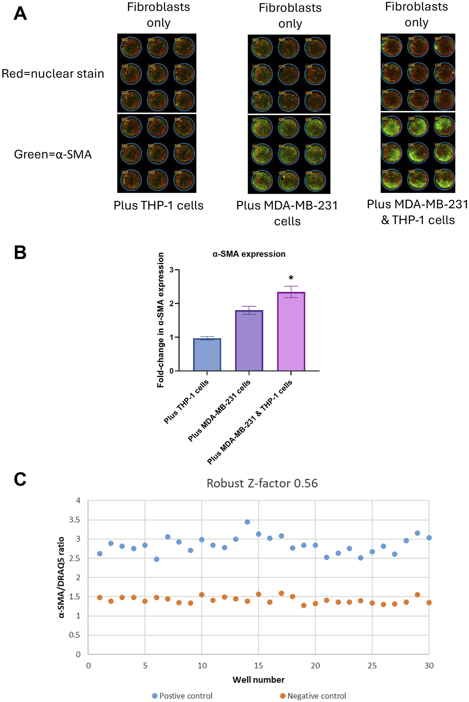 Assay development: (A) Infrared scanning image outputs showing fibroblasts without (top three rows) or with (bottom three rows) THP-1 cells only (left), MDA-MB-231 cells only (center) and MDA-MB-231 + THP-1 cells (right) using In-Cell ELISA (ICE) method. Green color denotes expression of α-SMA, red color denotes DRAQ5 nuclear staining. (B) Quantification of fold-change of α-SMA/DRAQ5 ratio. *p < 0.05 using Student’s t-test. (C) Robust Z′ value and a graph showing α-SMA/DRAQ5 ratios for each well of a 96-well plate. The data were obtained from three replicates from two donors.