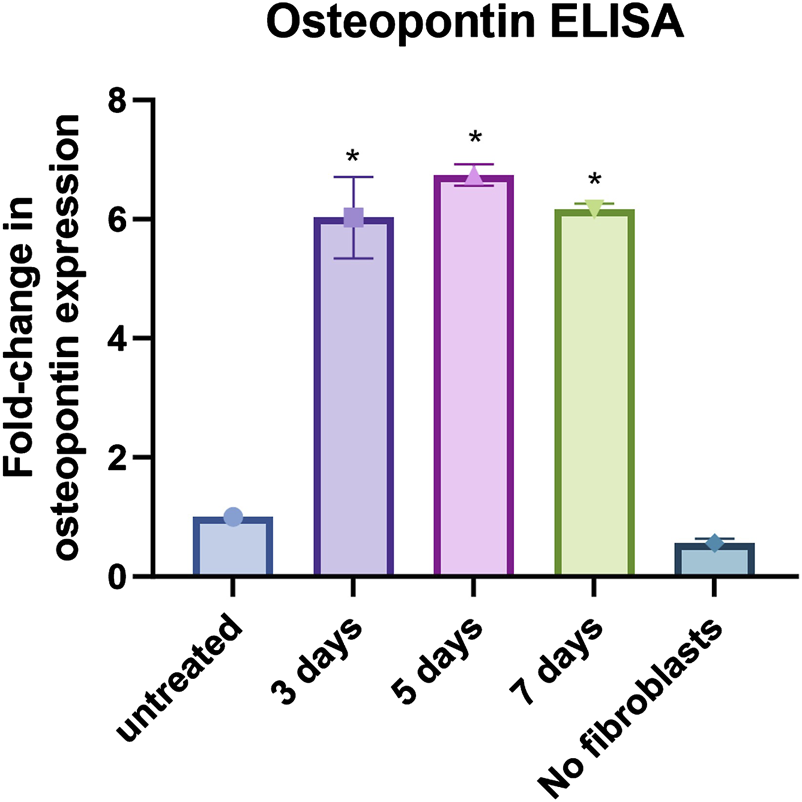 Osteopontin ELISA assay: Results from osteopontin ELISA assay for fibroblasts only (untreated), fibroblasts co-cultured with MDA-MB-231 and THP-1 cells for 3, 5 and 7 days, and MDA-MB-231 and THP-1 cells without fibroblasts (no fibroblasts). Data shown as fold-change in expression compared to fibroblasts only. *p < 0.05 using One-way ANOVA with multiple comparisons. The data were obtained from three replicates from two donors.