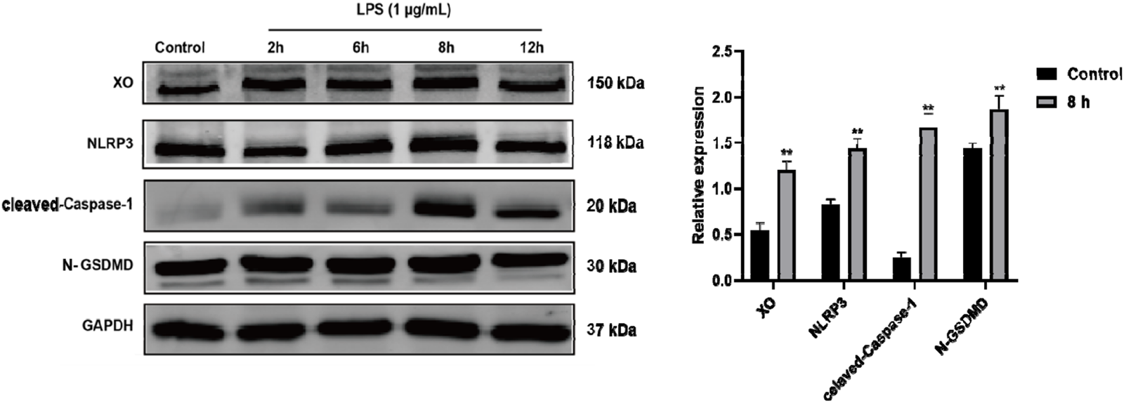 Time-related LPS-induced expression of XO, NLRP3, Caspase-1, and GSDMD proteins in RAW264.7 macrophages. Representative blots are shown. Compared to Control group, **p < 0.01. n = 3 per group.