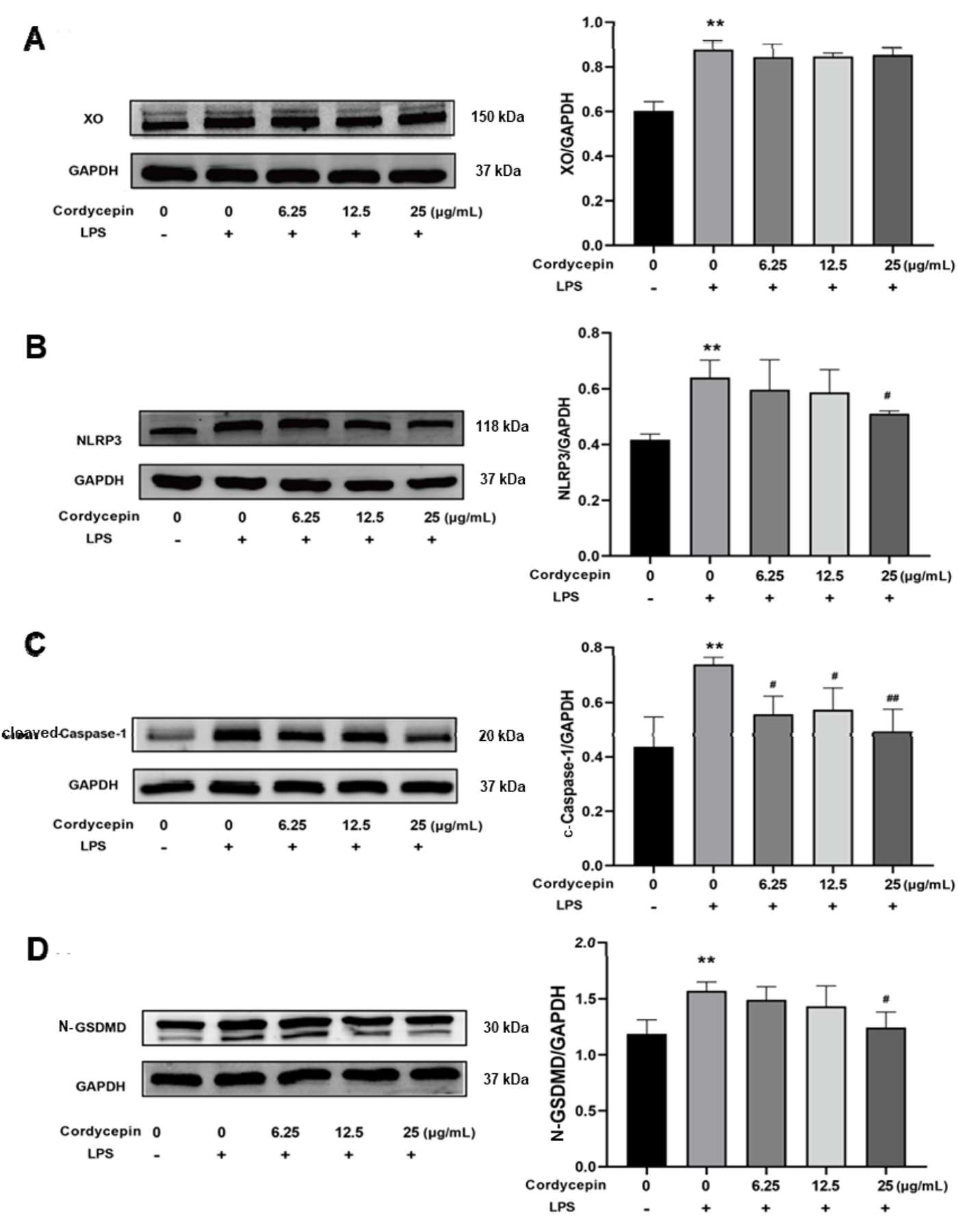 Effects of cordycepin on relative activity of (A) XO, (B) NLRP3, (C) Caspase-1, and (D) GSDMD in LPS-treated RAW264.7 macrophages. Compared to sham group, **p < 0.01; compared to LPS-only group, #p < 0.05; ##p < 0.01. n = 3 per group.