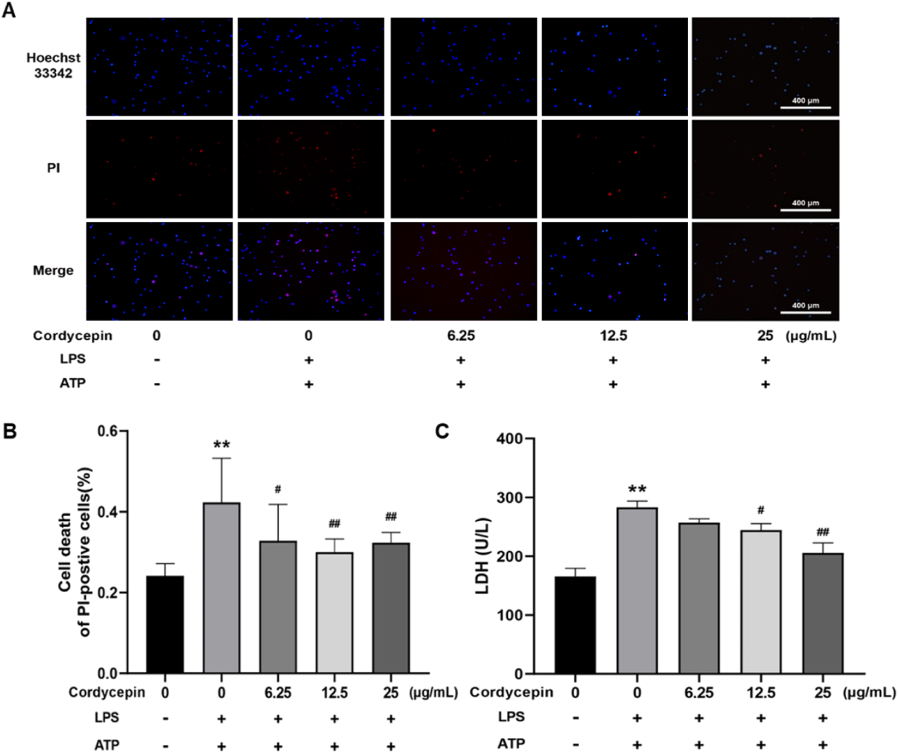 RAW264.7 cells were seeded into 12-well plates at a density of 5 × 104 cells/well (1 mL/well). After 12 h of incubation at 37°C, the wells were randomly assigned to one of five groups. The groups included: cells treated with DMEM medium only (sham), 1 μg/mL LPS + 5 mM ATP (Solarbio, Beijing, China), or 1 μg/mL LPS + ATP in conjunction with low-, medium-, or high-dose cordycepin (6.25, 12.5, and 25 μg/mL cordycepin). All groups were then cultured for 24 h. Morphological changes associated with pyroptosis and pyroptotic cell death were assessed using Hoechst 33342/propidium iodide (PI) dual staining and examined under a TH4-200 fluorescence microscope (Olympus Corporation, Tokyo, Japan). PI staining indicates loss of membrane integrity and cell death. Additionally, LDH activity (which reflects cell death and the release of intracellular enzymes) in the medium collected from each well prior to staining was measured using an LDH kit (Nanjing Jiancheng Bioengineering Institute, Nanjing, China).