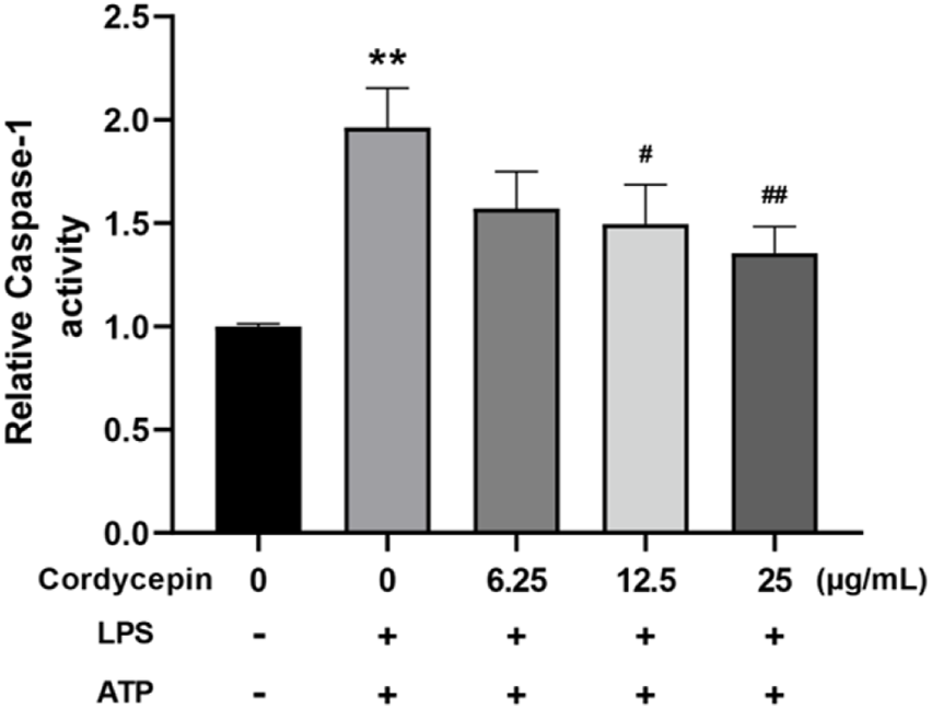 Cordycepin effects on caspase-1 activity in LPS/ATP-treated RAW264.7 macrophages. Compared to sham group, **p < 0.01; compared to LPS-only group, #p < 0.05; ##p < 0.01. n = 3 per group.