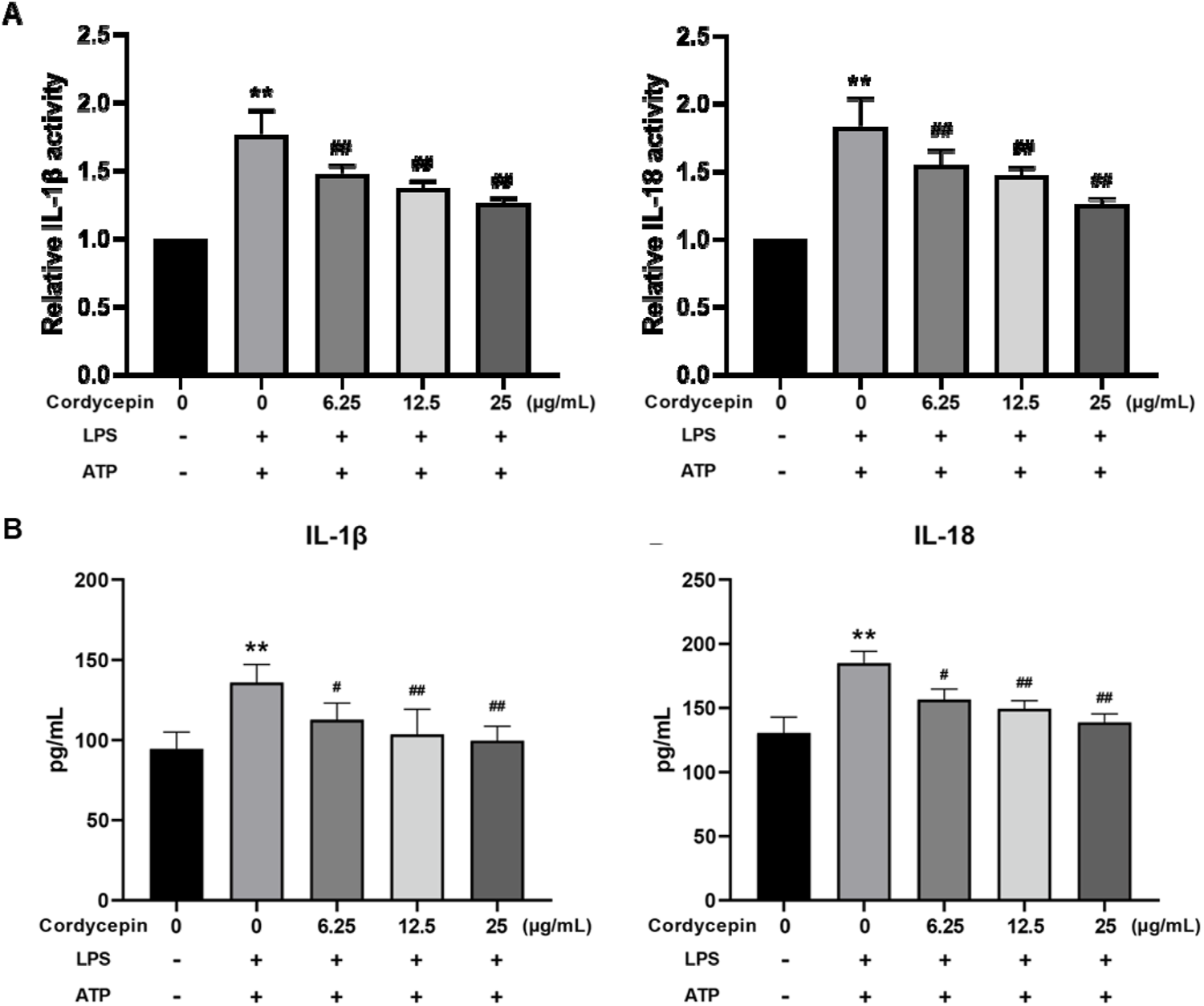 Effect of cordycepin on IL-1β and IL-18 (A) expression, and (B) secretion by LPS + ATP-treated RAW264.7 macrophages. Compared to sham group, **p < 0.01; compared to LPS-only group, #p < 0.05; ##p < 0.01. n = 3 per group.