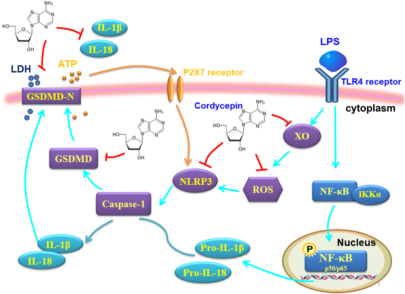 Cordycepin - the main active ingredient isolated from Cordyceps militaris (belonging to the purine alkaloids) - is a natural nucleoside analogue (Wang et al., 2022). Over a wide range of studies, it has been shown that cordycepin can impart various pharmacological effects and biological activities, including anti-tumor, immunoregulatory, anti-inflammatory activities (Radhi et al., 2021). In several in vivo studies, the impact of cordycepin on macrophages/related macrophage-driven pathologies was evaluated. In one study, cordycepin was found to improve the inflammatory state associated with intervertebral disc degeneration in rat, in part, by its ability to inhibit activation of macrophages and their infiltration into affected tissues (by regulating NF-κB signaling pathways) (Li et al., 2016). In another study, in a complete Freund’s adjuvant (CFA)-induced mouse paw inflammation model, cordycepin was shown to significantly inhibit localized secretion of inflammatory factors such as tumor necrosis factor (TNF)-α, interleukin (IL)-1β, and IL-6 in the inflamed mouse paw, thereby reducing the aggregation of macrophages in the area (Yang et al., 2020; Cheng et al., 2017) found that cordycepin could impart neuroprotective effects in a rat model of cerebral hemorrhage, and that this effect was due, in part, by an inhibition of the activation of NLRP3 inflammasomes. Despite these findings, the precise molecular mechanisms by which cordycepin modulates NLRP3 inflammasome activation and pyroptosis remain poorly understood. The NLRP3 inflammasome’s role as a central hub in inflammatory signaling suggests that cordycepin’s effects on this pathway could be pivotal in mediating its anti-inflammatory properties. Investigating these interactions may provide deeper insights into cordycepin’s therapeutic potential.