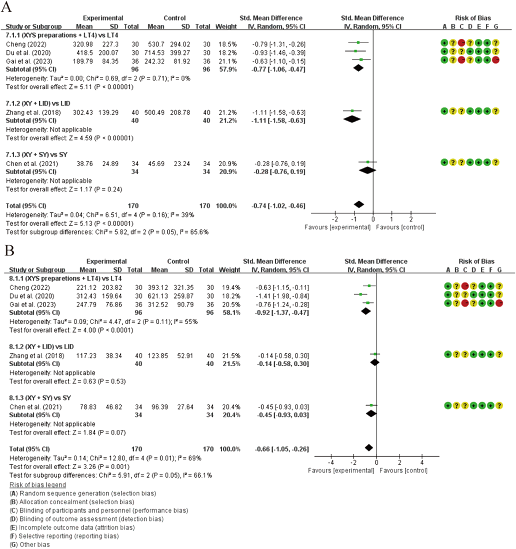 Forest plots of the effectiveness comparison of autoantibodies (XYS preparations vs LT4, LID, and SY): (A) TPOAb; (B) TgAb.