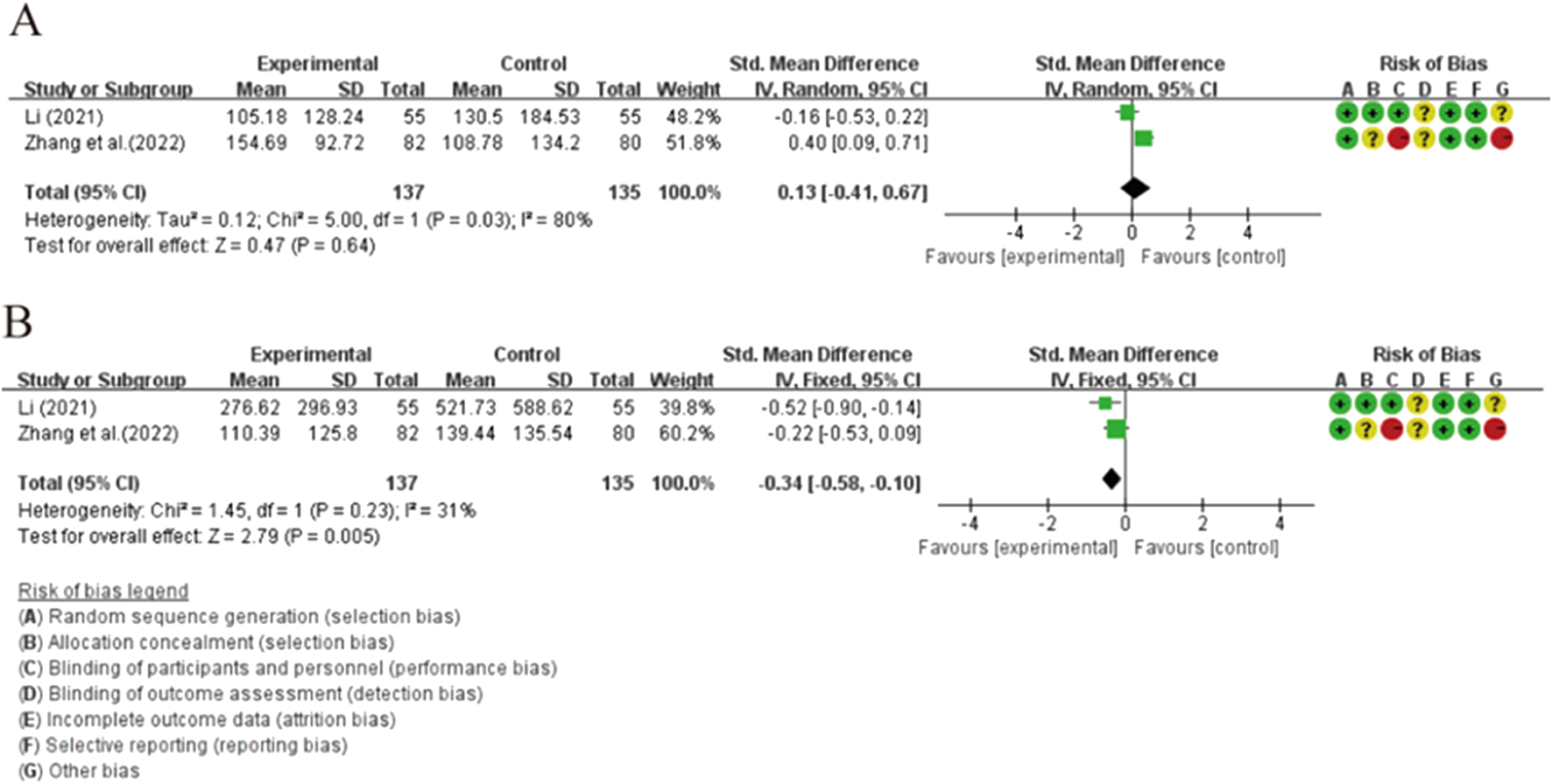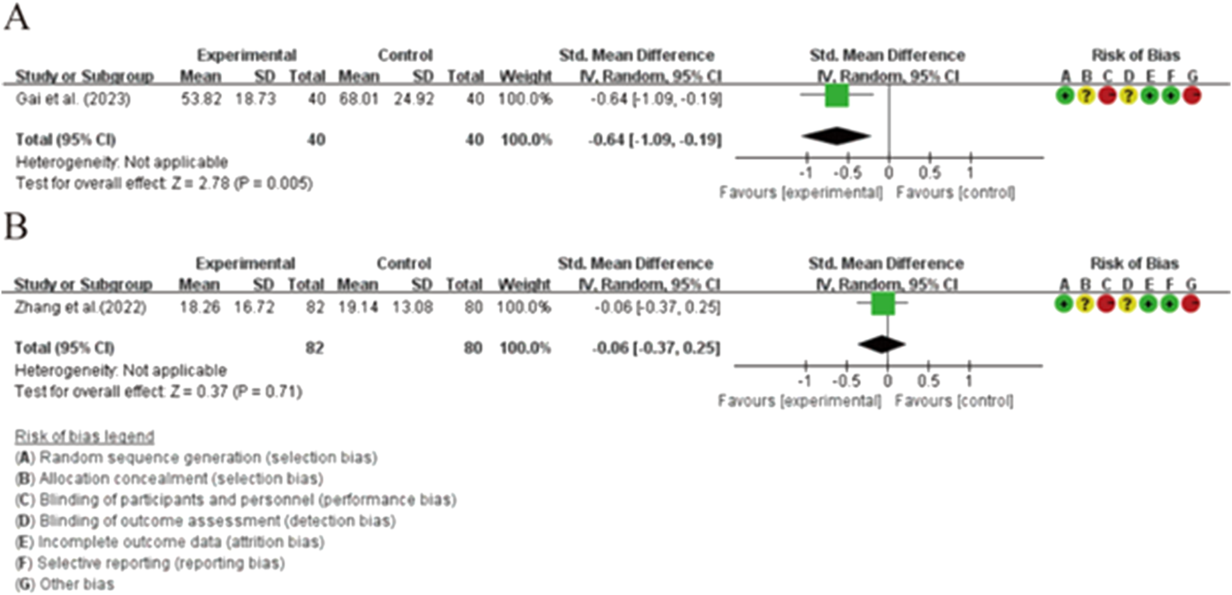 The investigators utilized the Cochrane Risk of Bias tool in RevMan 5.4 software (Higgins et al., 2011) to assess the quality of the included studies in the following dimensions: a) Random sequence generation, b) Concealment of allocation, c) Blinding of participants and personnel, d) Blinding of outcome assessment, e) Incomplete outcome data, f) Selective reporting, and g) Other biases. The risk outcomes were categorized into three levels: low, unclear, and high. Two reviewers conducted separate evaluations to determine the potential for bias in the studies that were included. Any conflicts were resolved through collaborative deliberation involving a third reviewer.